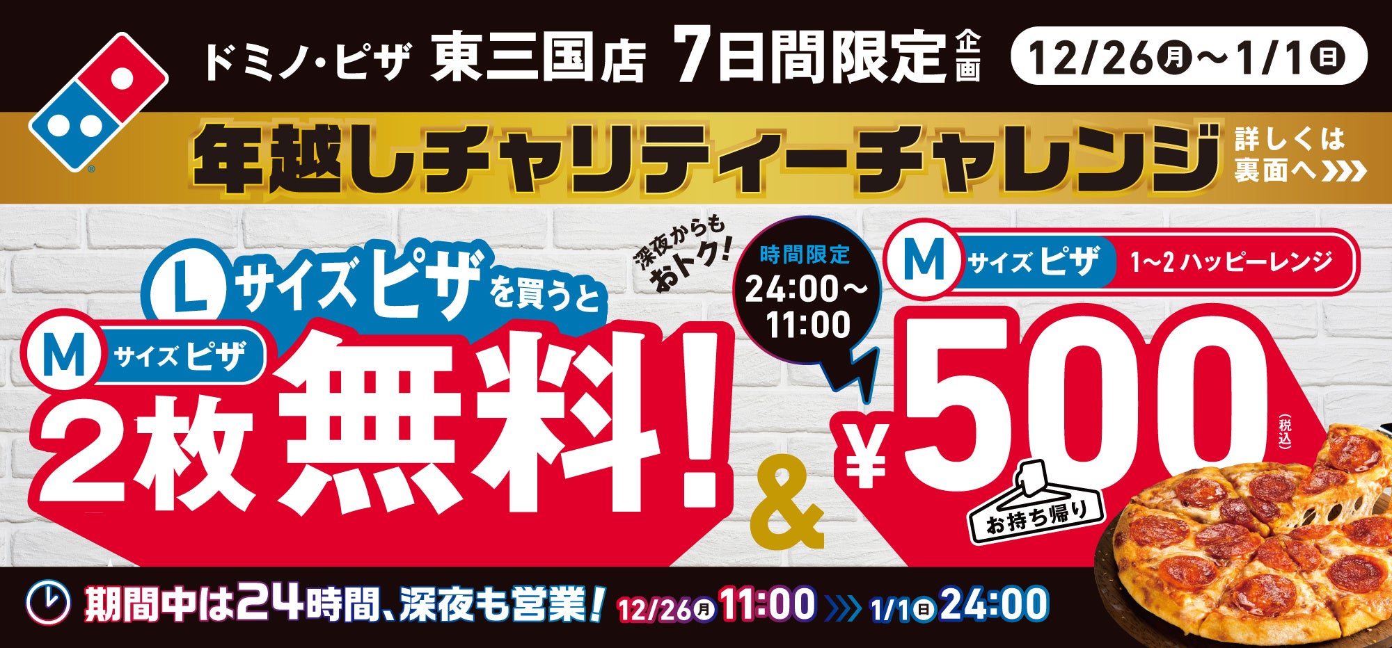 | 【ポイント】 · 日本中で、大阪東三国店だけの店舗限定・期間限定のスペシャル・キャンペーンです! · ドミノ・ピザ大阪1号店が大阪の意地をかけて、東京の「ドミノ・ピザ日本売り上げNo.1記録」に挑みます! · 期間中は24時間営業でピザをお届けします! · 今年ネットで大きな話題となった伝説のキャンペーン「1枚買うと2枚無料」を実施します。 · 夜24時から翌朝11時まで、1-2ハッピーレンジMサイズがお持ち帰り500円!最大1,260円おトク! · 大阪のお客様に感謝を込めて、1枚につき100円を大阪の子ども支援NPOに寄付します!利益度外視!ドミノ・ピザ史上最大の寄付プログラムです!大阪の皆さんの応援よろしくお願いします。 |