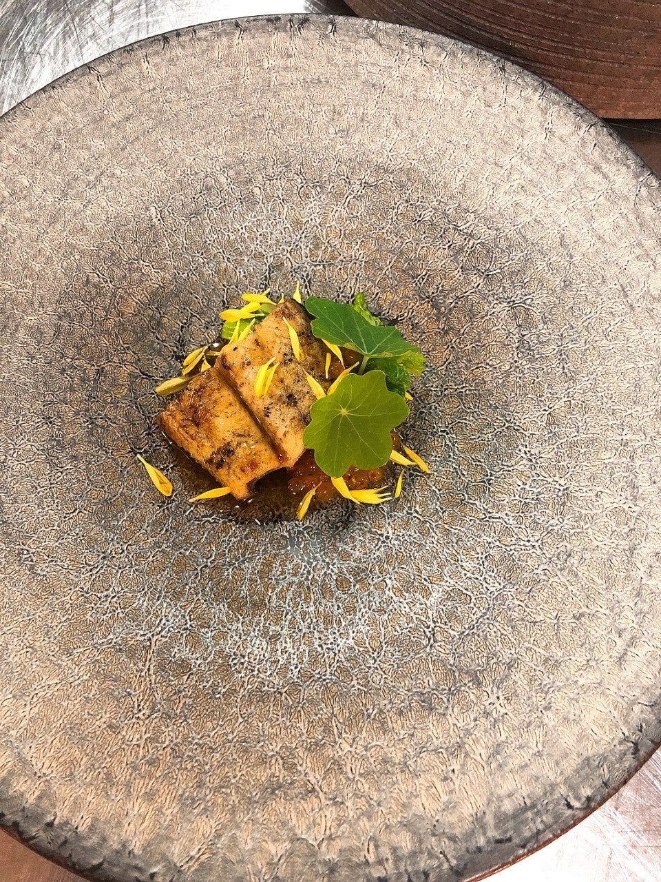 前菜にスペルト小麦、紅ズワイ蟹を使用し2種の調理法で食感と様々な食材のハーモニーをお楽しみください。魚料理を軽い煮込み風に仕立て魚介の旨味に蟹の味わいをプラスした心温まる内容となっています。