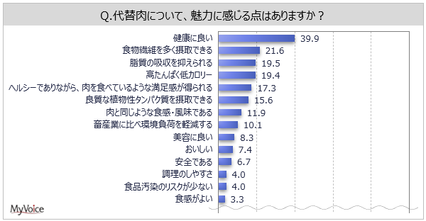 代替肉について魅力に感じる点は(複数回答)、「健康に良い」が39.9%、「食物繊維を多く摂取できる」「脂質の吸収を抑えられる」「高たんぱく低カロリー」「ヘルシーでありながら、肉を食べているような満足感が得られる」が2割前後です。