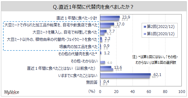 | <今 回>(2022/12)https://myel.myvoice.jp/products/detail.php?product_id=29301 ※上記設問の他に、「代替肉の認知」「直近1年間に購入したタイプ」なども聞いています。 <第1回>(2020/12)https://myel.myvoice.jp/products/detail.php?product_id=26902 |