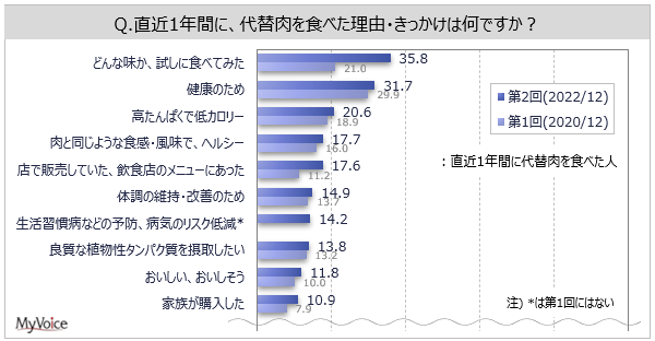 直近1年間に代替肉を食べた人の理由・きっかけは(複数回答)、「どんな味か、試しに食べてみた」が35.8%、「健康のため」が31.7%、「高たんぱくで低カロリー」「肉と同じような食感・風味で、ヘルシー」「店で販売していた、飲食店のメニューにあった」が2割前後となっています。2020年調査と比べて、「どんな味か、試しに食べてみた」が増加しています。