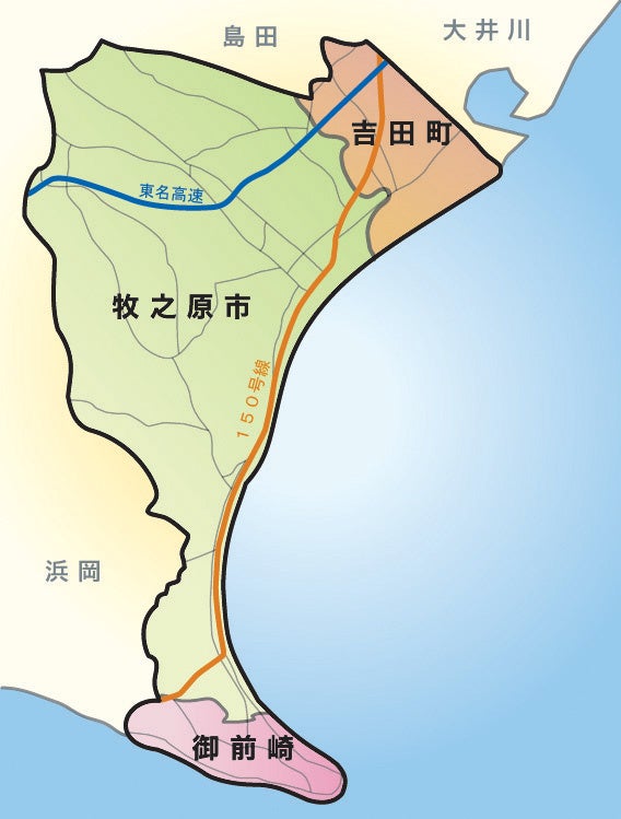 当地域は、東は大井川、西にはマリンスポーツの聖地として、また全国屈指のウミガメの産卵地として知られる御前崎。北には全国有数の茶産地「牧之原大茶園」が広がり、南には広大な砂浜と遠浅の海岸線で駿河湾に面しています。