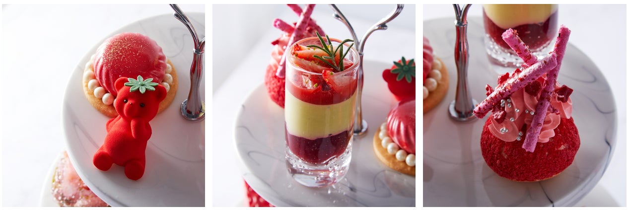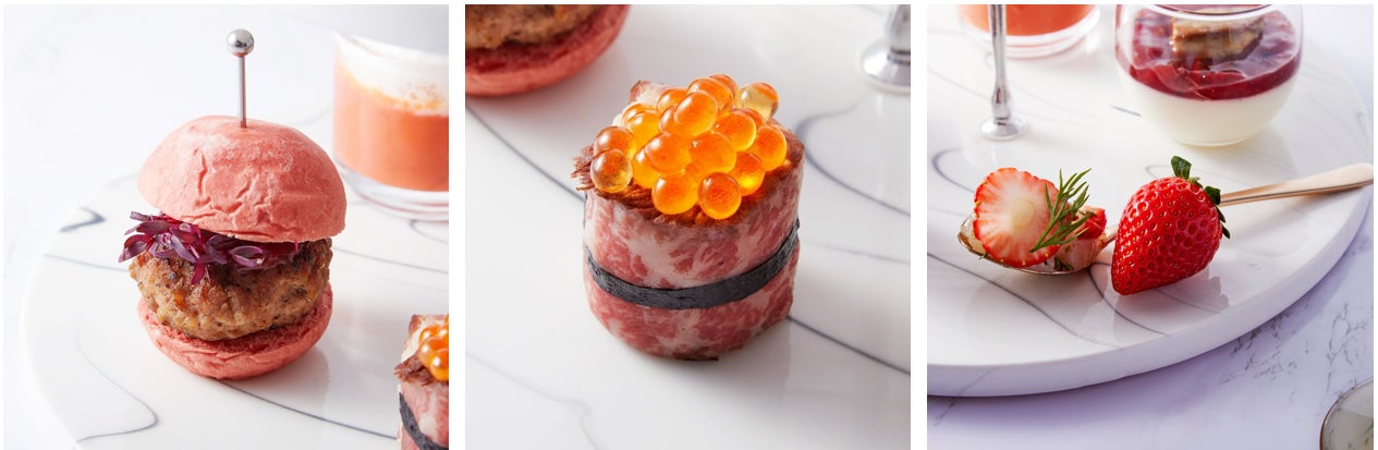 ストロベリーモヒートのウェルカムドリンクをはじめ、苺のミルフィーユやタルトなど、苺づくしのスイーツが盛りだくさん。こだわりのセイボリープレートには、鹿児島県産A5黒牛を使用した“ローストビーフ寿司とイクラ”や、“鴨肉パティのミニバーガー” 等、ストロベリーカラーのメニューが並びます。