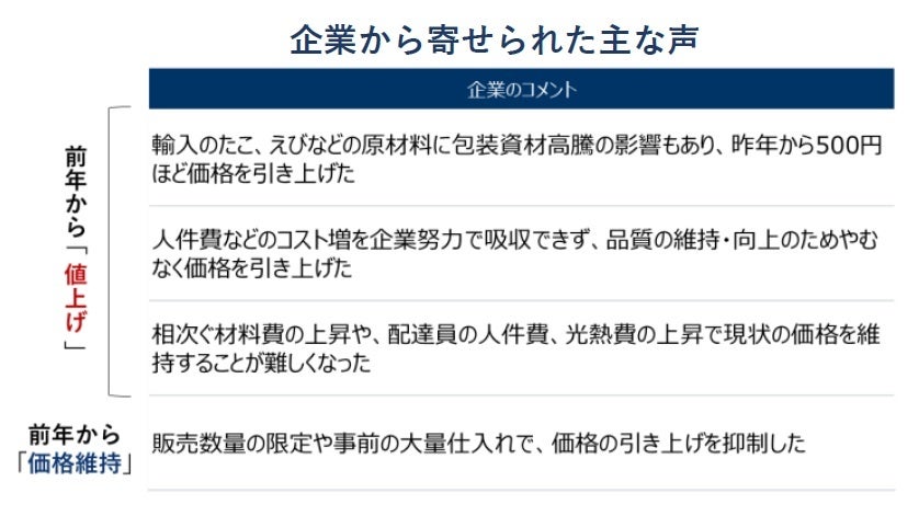 背景には、おせち料理に欠かせない鮮魚価格の値上がりがあげられる。見た目を彩るおせちの定番として欠かせない数の子やえび、いくらといった生鮮魚介類の取引価格は大きく上昇。11月時点で、国内産いせえびの市場取引価格は前年同月比で40%上昇したほか、数の子は23%、煮たこは16%、いくらも3%それぞれ上昇した。外国産が多い鮮魚類では円安や原油高の影響で仕入れ値が上昇しやすく、品質維持を目的に価格アップに踏み切らざるを得なかったおせちが多くみられた。海鮮食材を多く使用しないおせちでも、化粧箱などの資材費上昇などが響いたことで値上げとなったケースもあった。