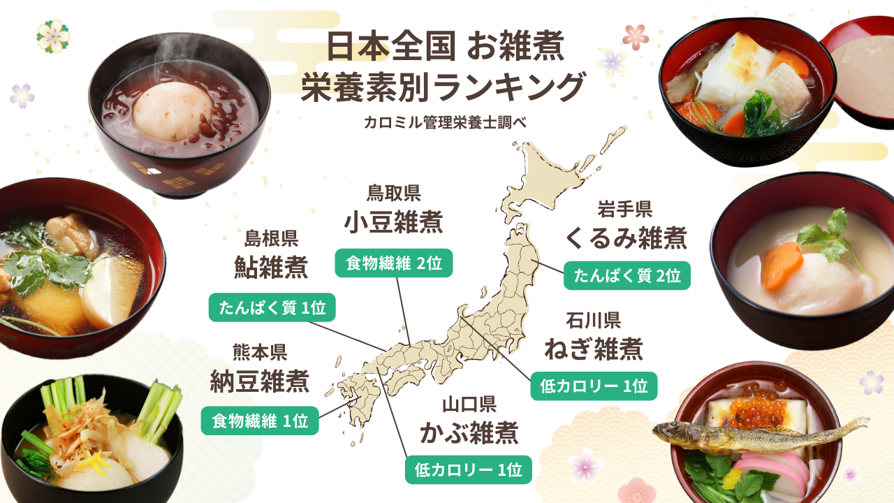 食事・運動・体重管理アプリケーション(以下アプリ)「カロミル」の開発・提供をするライフログテクノロジー株式会社(東京都中央区、代表取締役:棚橋繁行)は、栄養素やカロリー別のお雑煮に関するランキングを発表いたしました。