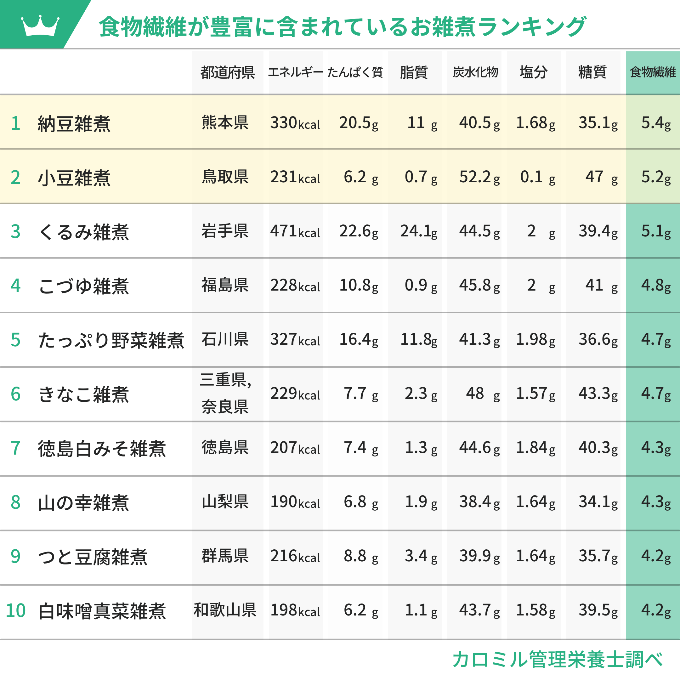 1位は熊本県の一部地域で食べられている「納豆雑煮」。鰹と昆布から取った出汁に、甘い醤油を加え味付けした雑煮の中から丸餅のみを取り出し、納豆にからめて食べるのが流儀だそう。納豆が入ることで食物繊維はもちろんのこと、たんぱく質もしっかり摂ることができます。2位の鳥取県で食べられている「小豆雑煮」は、ぜんざいタイプのお雑煮で山陰だけでなく日本全国で食べられています。小豆は、食物繊維やビタミンB群・ミネラル・ポリフェノールなどが豊富な食材です。特に不溶性食物繊維が多く含まれているので、便秘改善に期待ができますよ。