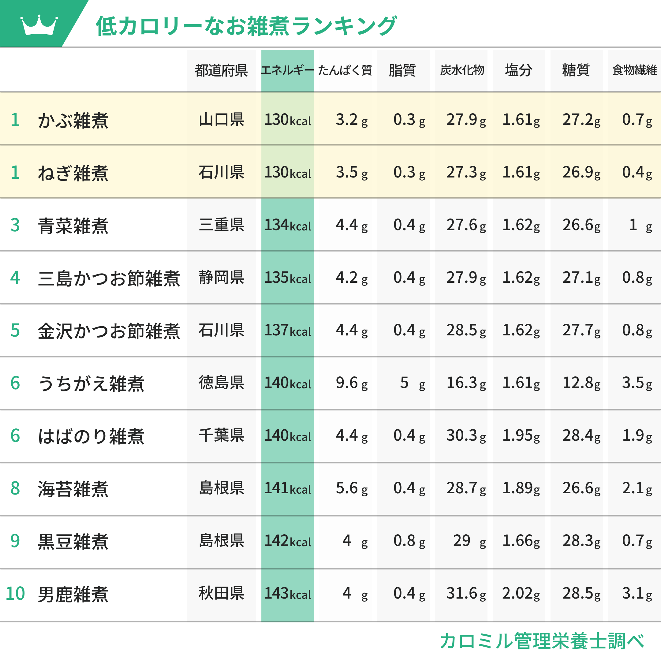 ランキング1位で最も低カロリーだったのは山口県の「かぶ雑煮」。すまし汁にお餅、かぶ、みつばが入ったシンプルなお雑煮で130kcalとなっています。同じく1位の石川県の「ねぎ雑煮」も130kcalとかなりヘルシーです。その他ランクインしているお雑煮も、青菜やかつお節、海苔などのシンプルな具材が使われています。