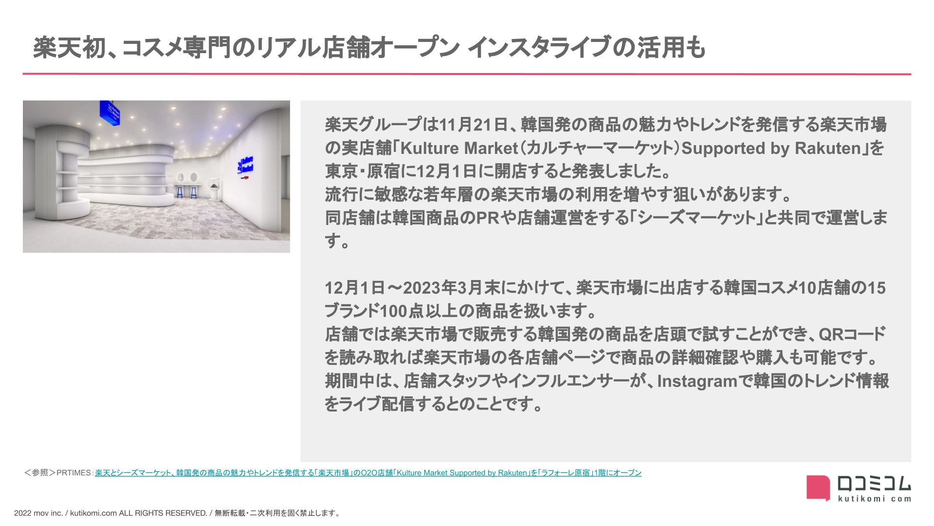 - 楽天初、コスメ専門のリアル店舗オープン インスタライブの活用も