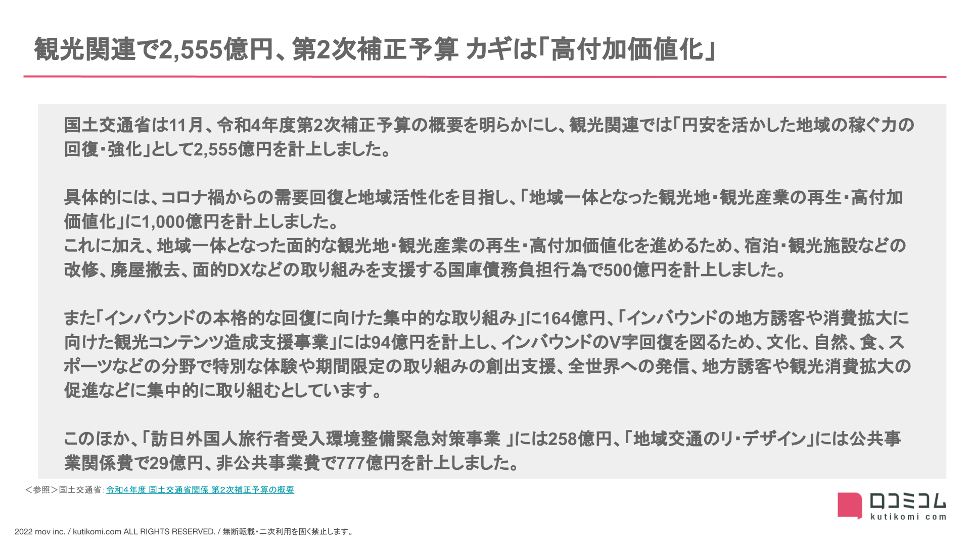 - 観光関連で2,555億円、第2次補正予算 カギは「高付加価値化」