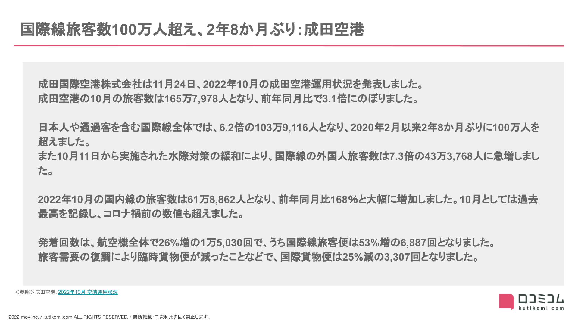 - 国際線旅客数100万人超え、2年8か月ぶり:成田空港