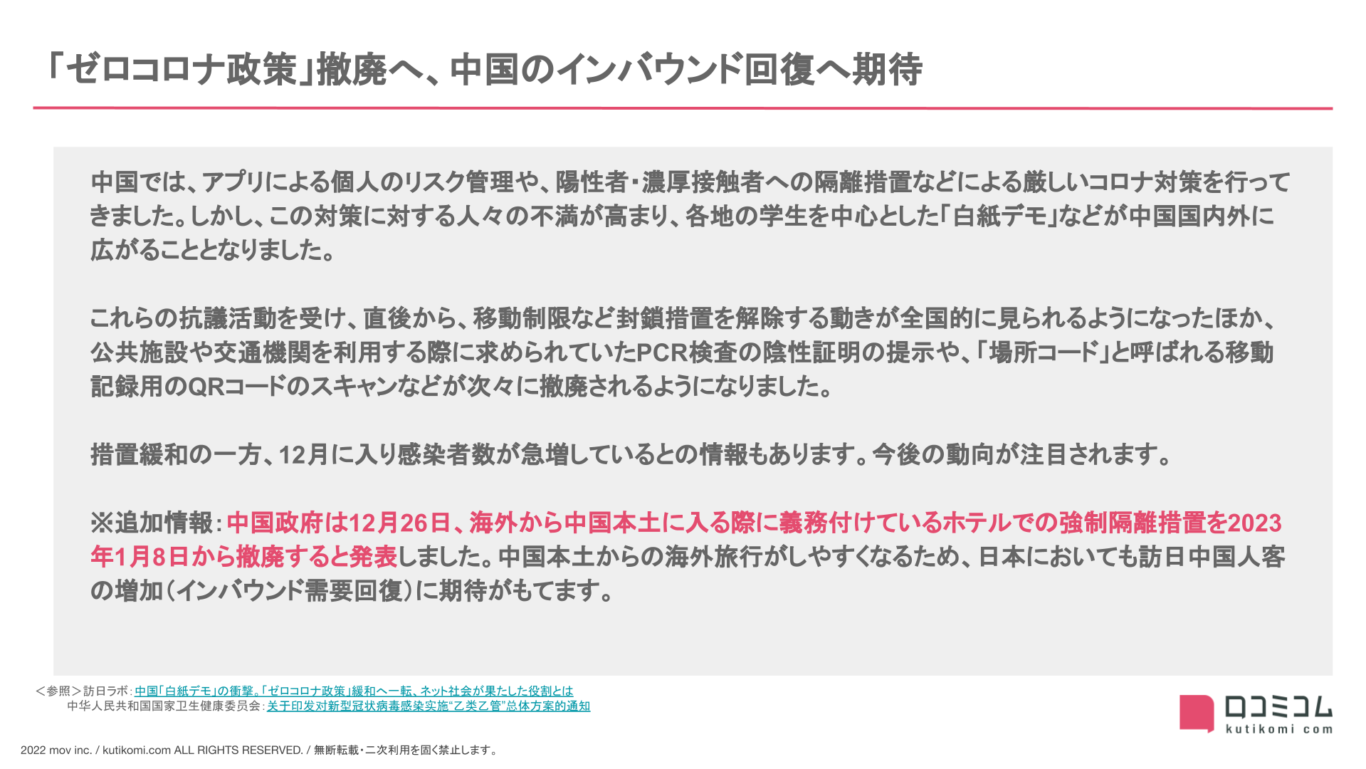 - 「ゼロコロナ政策」撤廃へ、中国のインバウンド回復へ期待