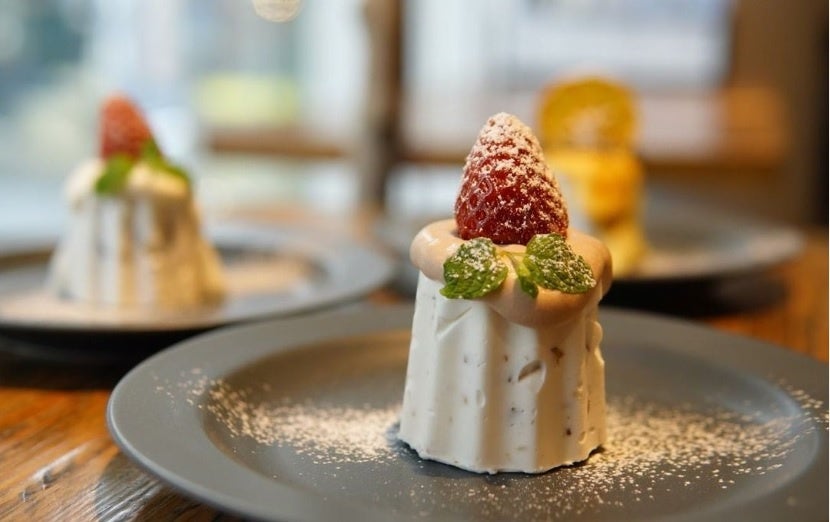 メニューは苺ショート(プレーン・チョコ)とオレンジブリュレの3種。アイスケーキなので出来立ては少し固く、5分ほどで程よい口溶けになってきます。テイクアウトも同価格で可能。