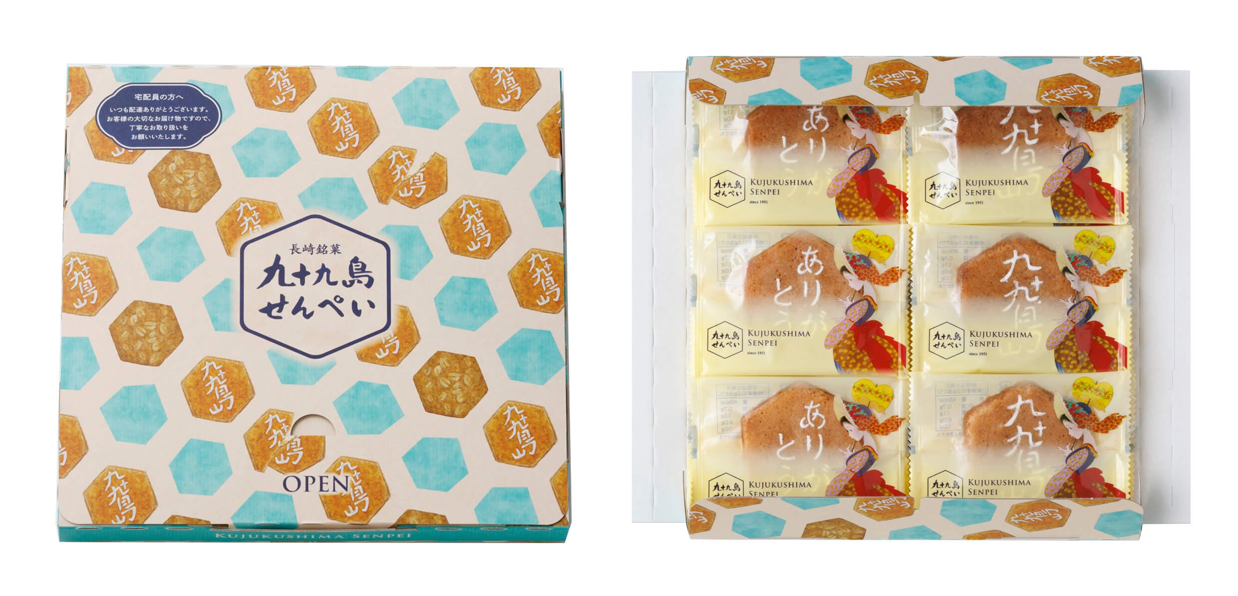 2021年に誕⽣70周年を迎えた「九⼗九島せんぺい」。さらなる⾶躍を誓う2022年は⼈気の8枚⼊(ガゼット袋)のデザインを⼀新いたしました。これまでにない、明るく楽しい雰囲気をパッケージから表現することで、地元・佐世保市をはじめ、全国のご家庭で愛される銘菓を⽬指しています。