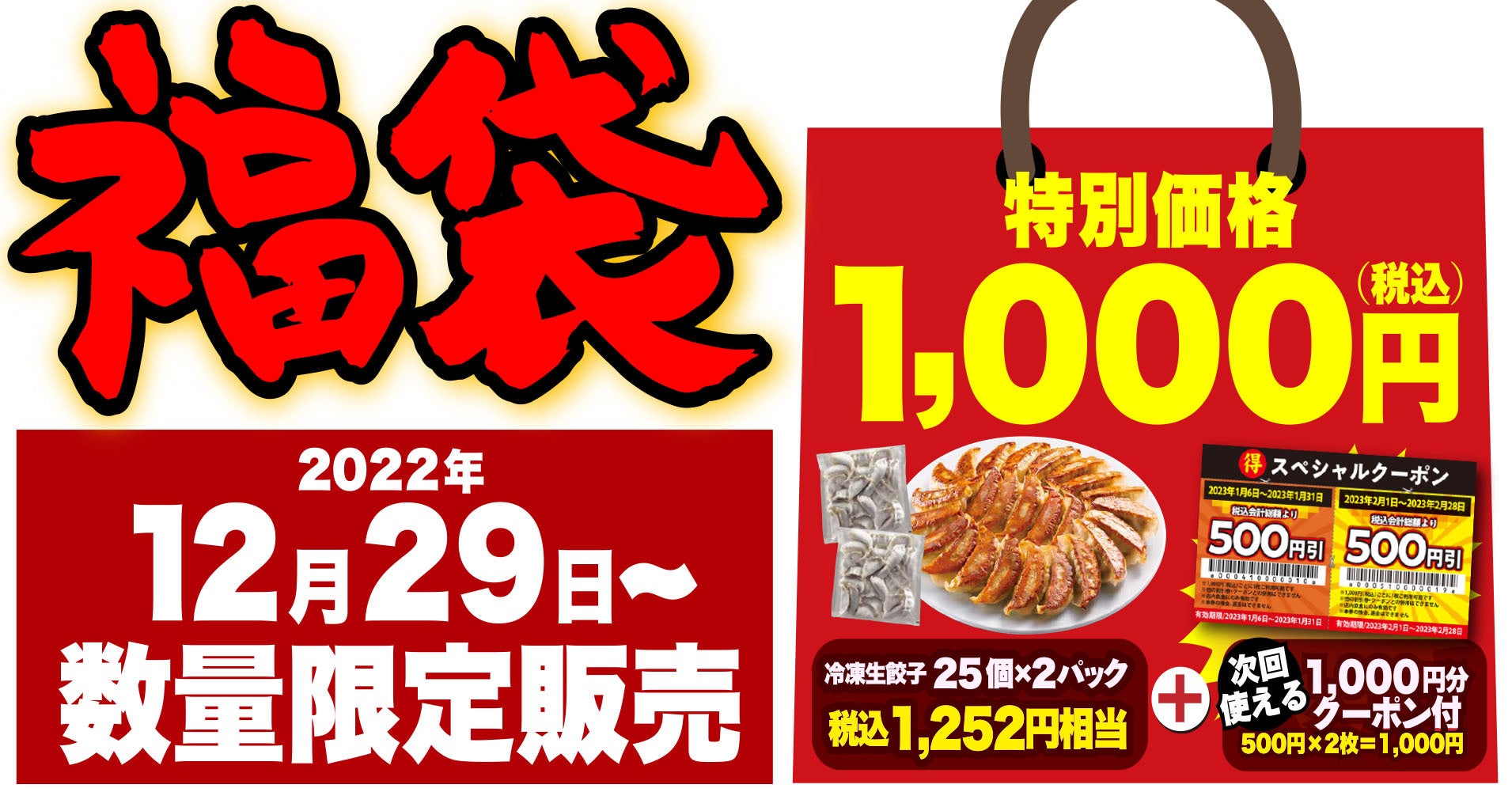 株式会社物語コーポレーション(本社:愛知県豊橋市/代表取締役社長:加藤 央之)が全国183店舗展開中の『丸源ラーメン』『二代目丸源』は、2022年12月29日(木)より期間限定で、「丸源餃子福袋」を1,000円(税込)で販売いたします。