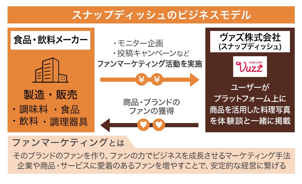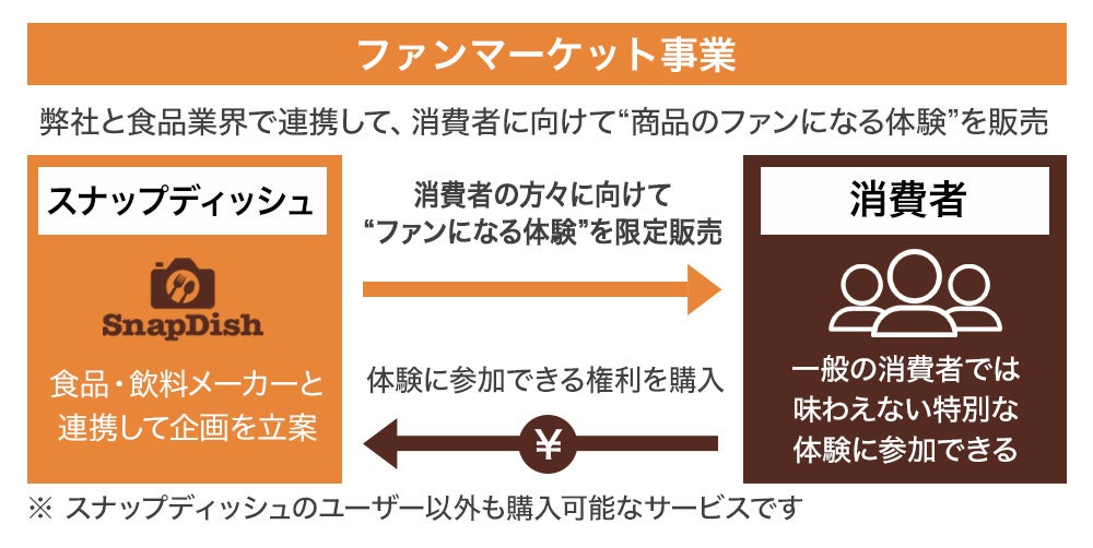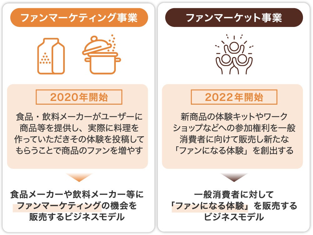 弊社は、食品・飲料メーカーが、商品モニターやキャンペーンなどを通じてユーザーにオンライン/リアルで商品を体験してもらうことができる「ファンマーケティング事業」と、弊社と食品業界の方々で連携して、消費者の方々に向けて“ファンになる体験”を販売する「ファンマーケット事業」の2つのビジネスモデルを展開しています。