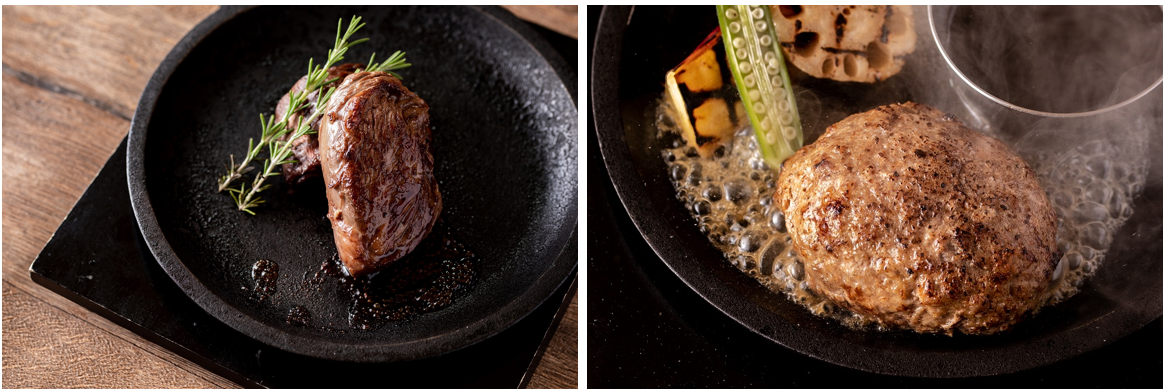 ■選べるメイン料理:炭焼きハンバーグ or炭焼き赤身肉の鉄板ステーキ(+300円)or宮崎牛ステーキ(+1,000円)