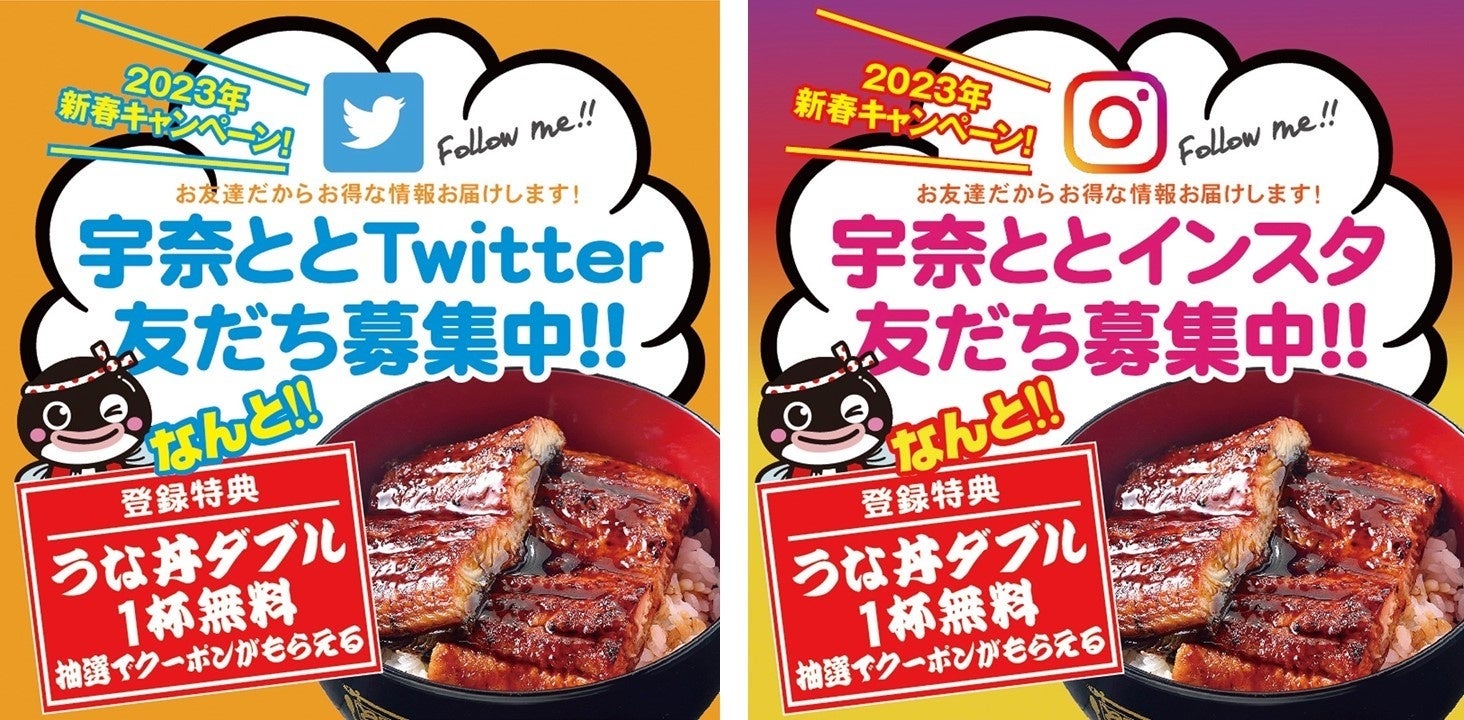 「名代 宇奈とと」のTwitterとInstagramの公式アカウントをフォローしていただき、それぞれリツイート+いいね、メンション付きシェアをしていただくと人気No.1メニュー「うな丼ダブル」のLINE無料クーポンが抽選で当たります。応募期間は2023年1月1~15日です。