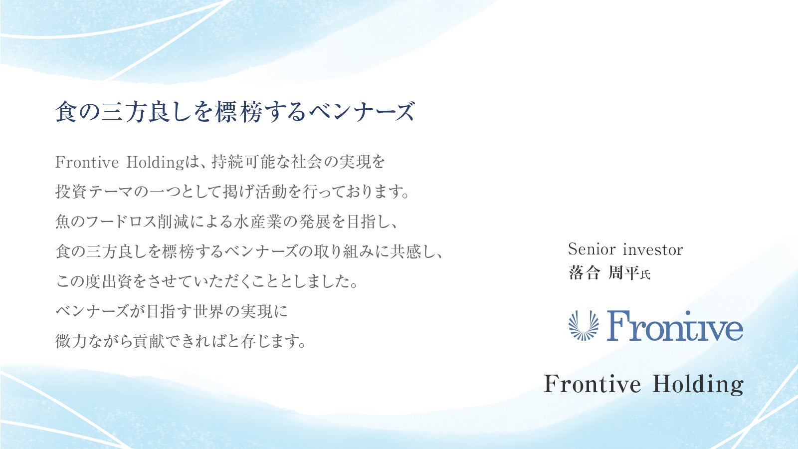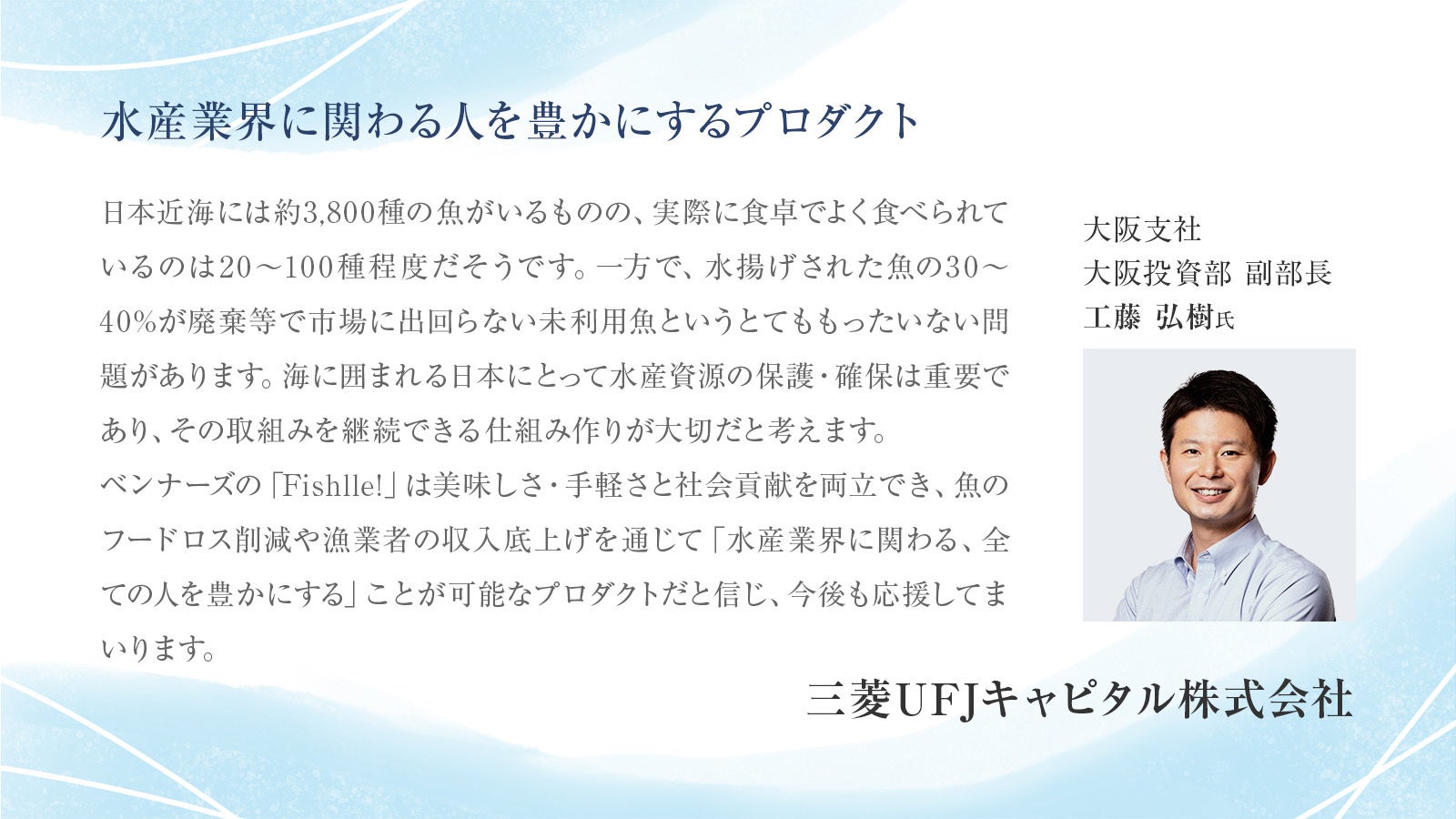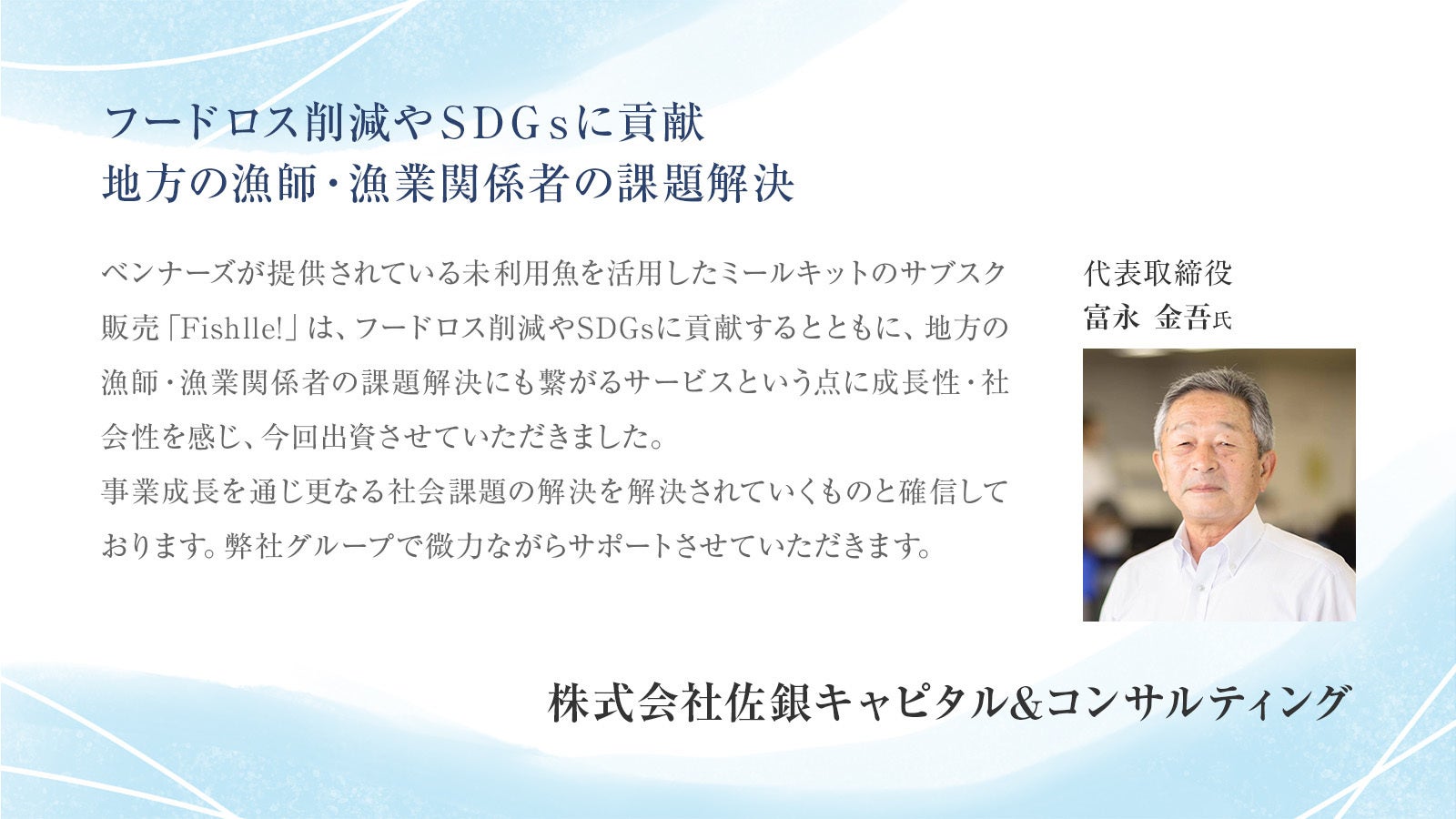 ベンナーズは魚のサブスクサービス「フィシュル」の全国展開を目指し、ご家庭からレストラン、学校、企業などでも魚の消費拡大を促すことで、水産業界を牽引するベンチャー企業として成長を加速させていきます。
