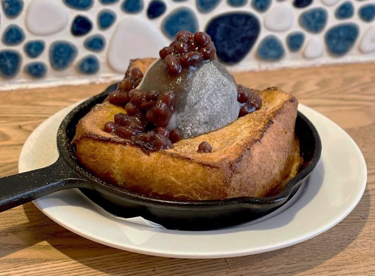 大人気「ムーの鉄板フレンチトースト」の期間限定メニューです。求肥で包んだ濃厚な黒ゴマアイスを丸々のせ、甘さ控えめの小豆ときな粉をトッピングしました!熱々のフレンチトーストで求肥アイスがじんわり溶け口の中でとろける絶品。