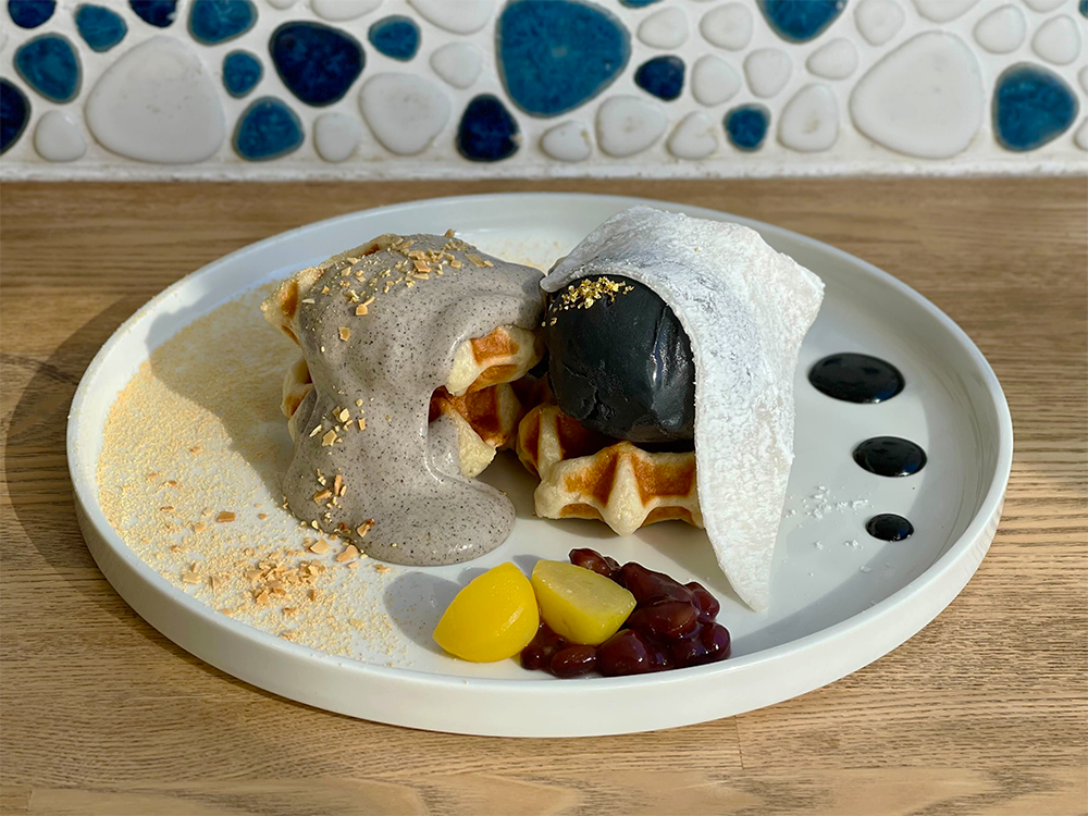 大人気食パン「ムー」の生地をワッフル型で焼いた「ムッフル」に、濃厚な黒ごまアイスと自家製の黒ごまクリームをのせ、求肥やきな粉、小豆、栗の甘露煮など、和の素材をトッピングしました。