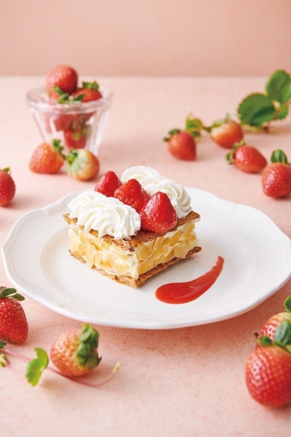 サクサクのパイ生地にカスタードクリームと上品な甘さの練乳ホイップをサンド、フレッシュな苺をふんだんに盛り込み香ばしいナッツのアクセントを加えて奏でるスィートなハーモニーをお楽しみください。