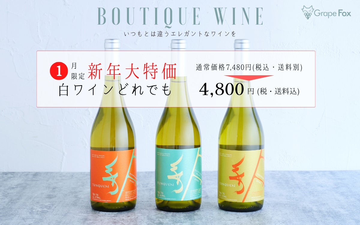 生産数10,000本以下の希少なブティックワインに限定した海外ワインの販売を行うインポートブランドGrapeFox(https://grapefox.jp/ 運営:MYA BRIDGE合同会社、本社所在地:神奈川県藤沢市、代表:橋本あかね)は、2023年1月4日(水)〜1月31日(火)までの間、白ワイン全3種すべてを通常価格7,480円(税込・送料別)のところ、特別キャンペーン価格4,800円(税・送料込)にて販売する、新春キャンペーンを実施いたします。