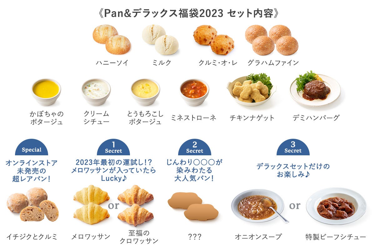 毎年大好評のPan&福袋。昨年は、第三弾までの予約販売が予定数量に達し、完売いたしました。これを受け、より多くの皆様に福袋を通じてPan&の焼きたてのおいしさを実感いただきたく、今年は新春福袋を数量限定で販売開始いたしました。お一人様、各2セットまでご購入いただけますので、ご友人やお世話になった方々へのプレゼントとしてもお使いいただけます。おせちやお正月料理に飽きてくる頃、パンやスープの洋食テイストの福袋はいかがでしょうか。
