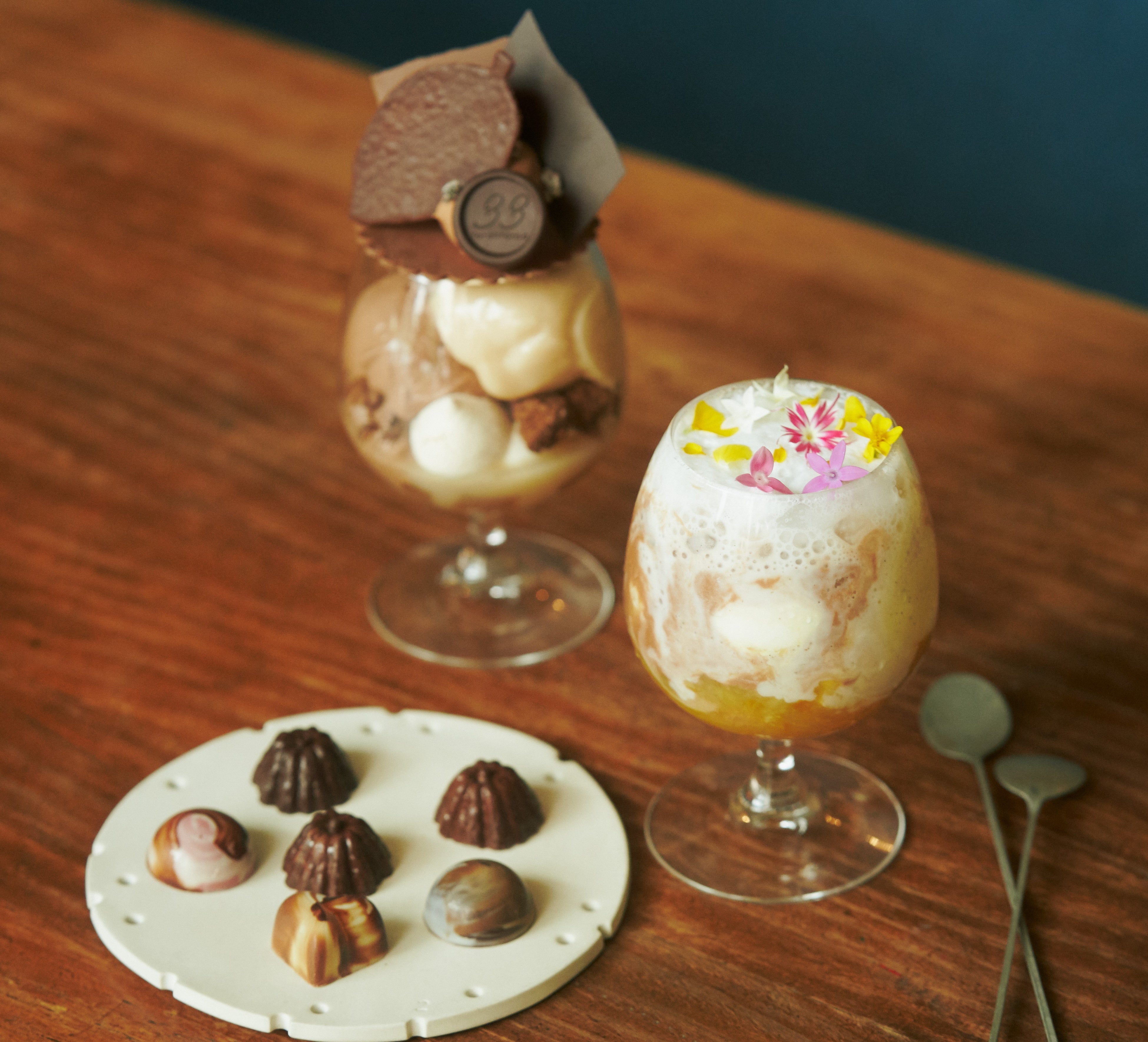 オリジナルのブレンドティーや、チャイを楽しむことができる恵比寿の人気店。桃とラズベリーのフローズンにアッサムのジュレとホワイトチョコレートを合わせた「モモラズベリージグリーティ」と〈アマゾンカカオ〉のニブをたっぷり使った風味豊かなチョコレートフローズンに、ほうじ茶ジュレを合わせた「アマゾンカカオニブジグリーティ」。