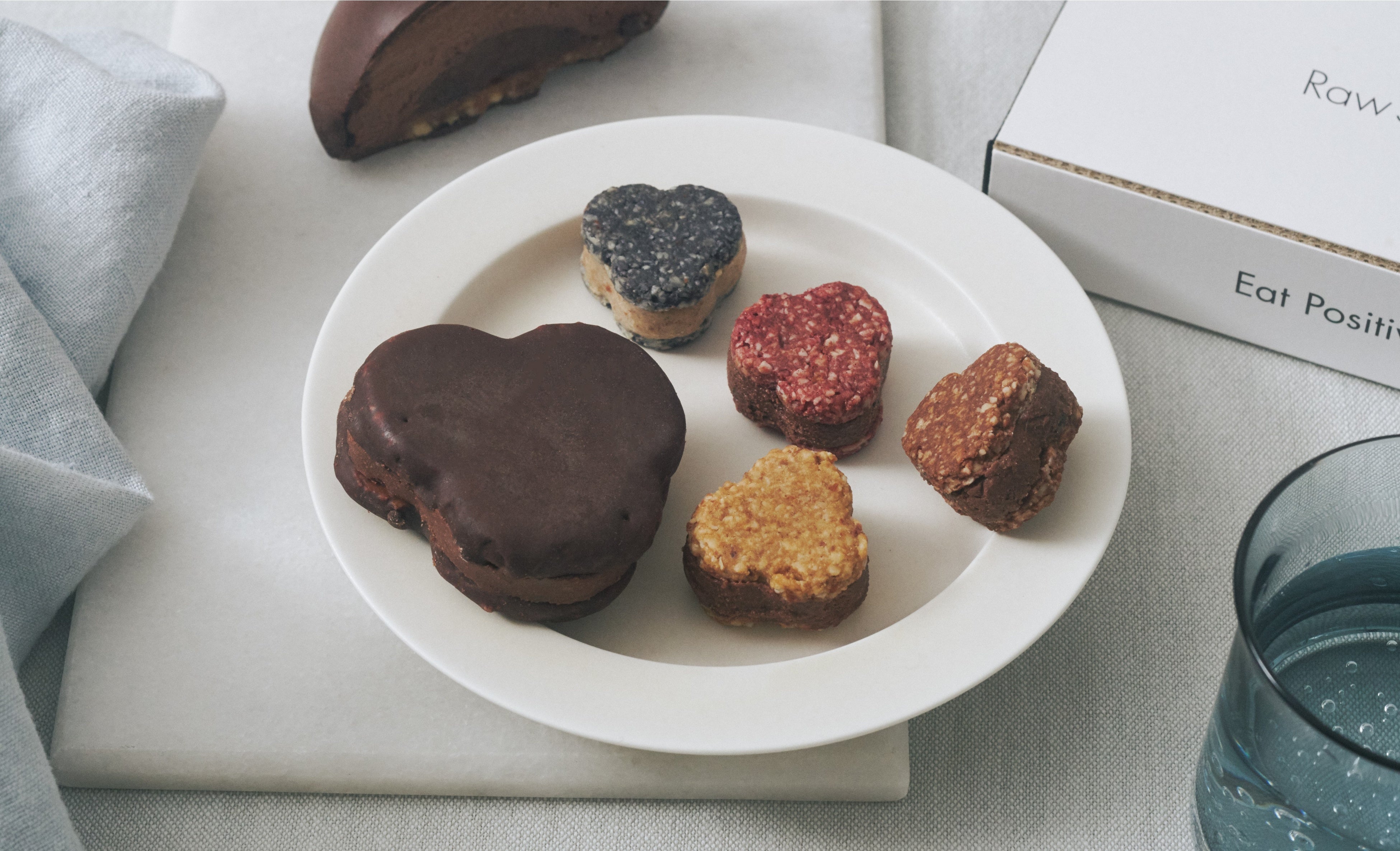 すべてのアイテムをローフード製法で仕上げる〈ロースーク〉。ローカカオたっぷり使ったガナッシュをロークッキーでサンドしたガナッシュサンドは、ビーツやターメリックで色とりどりに仕上げました。