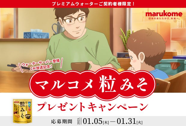 良質な水を育む日本有数の水源地から採取した天然水を、おいしさもミネラル分もそのままに保つ非加熱処理を施しご家庭に提供しているプレミアムウォーター株式会社(所在地:東京都渋谷区、代表取締役社長:金本 彰彦)は、マルコメ株式会社(所在地:長野県長野市、代表取締役社長:青木時男)の新TV-CM「料亭の味 息子にはかなわない篇」にプレミアムウォーターのウォーターサーバーが登場したことを記念し、『マルコメ粒みそプレゼントキャンペーン』を2023年1月5日(木)から開始いたします。