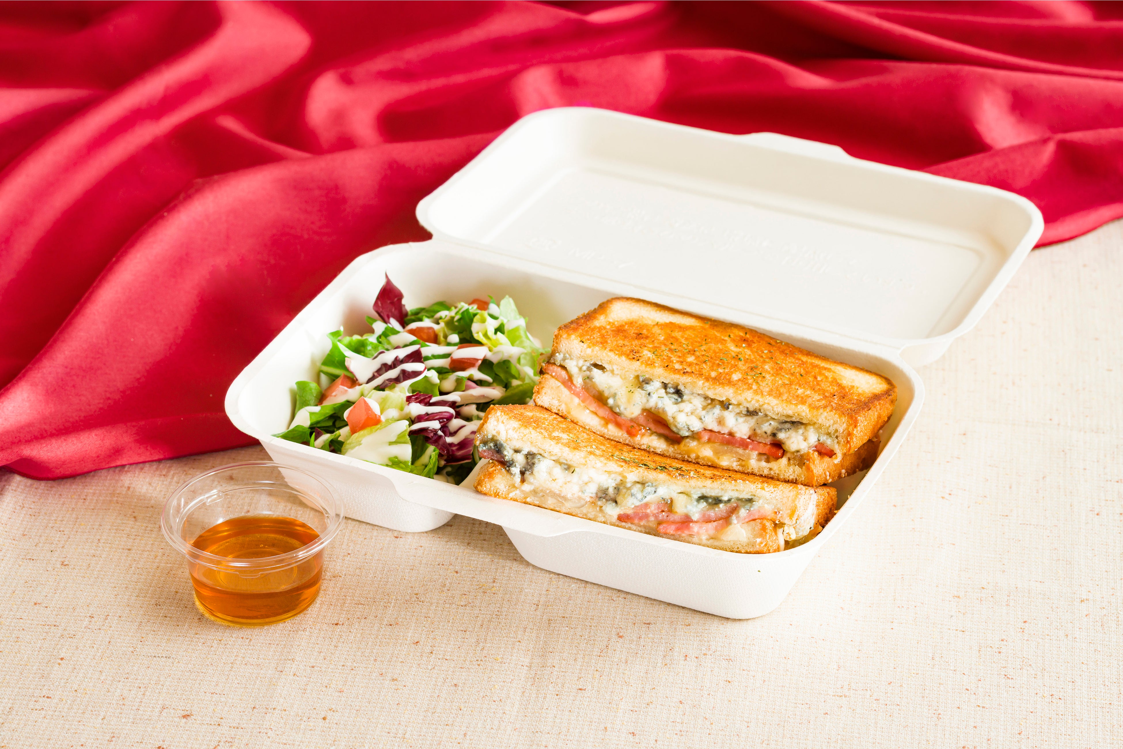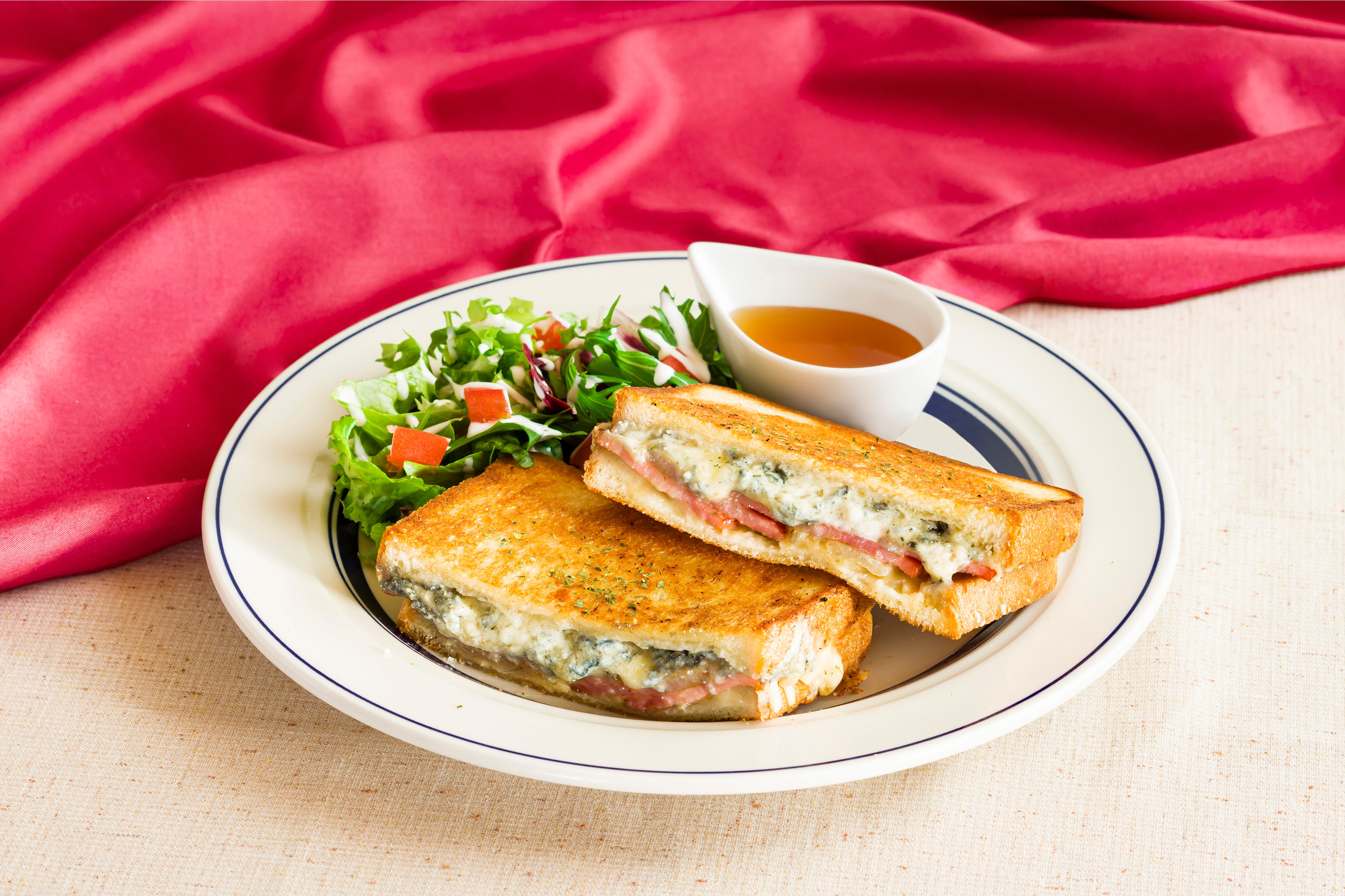 4種のチーズ(モッツァレラ・ゴーダ・パルメザン・ゴルゴンゾーラ)とベーコンを挟んだホットサンド。チーズに良く合うはちみつとご一緒にお楽しみください。