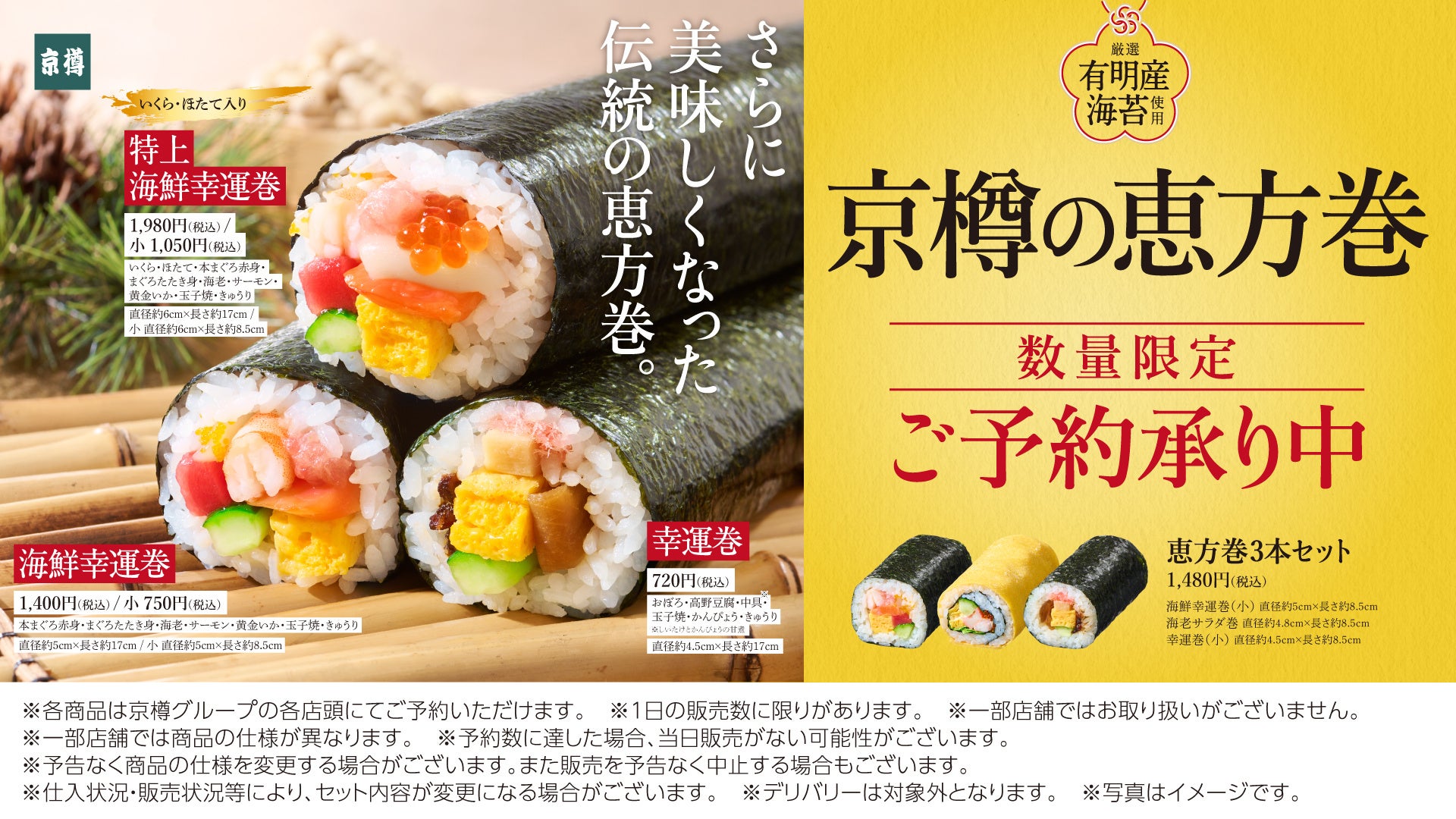 各商品は数量限定のご用意です。事前にご予約いただければ、節分当日は並ばずに店舗でお受け取りいただけます。ぜひ、今年の節分には「京樽」の恵方巻をご賞味ください。
