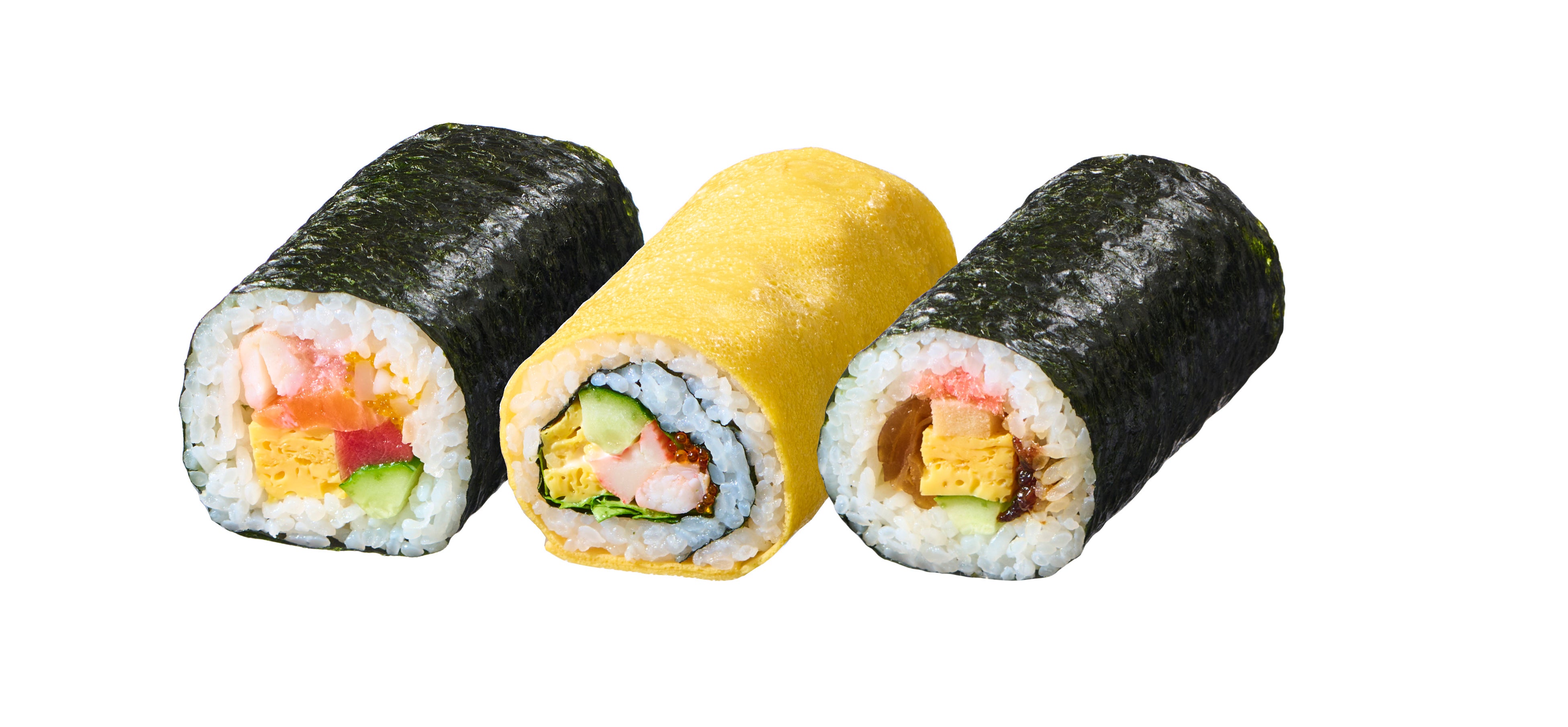 今回登場する「特上海鮮幸運巻」は、まぐろの濃厚な旨味と風味が楽しめる“まぐろの王様”本まぐろの赤身をはじめ、ほたて、海老、サーモン、まぐろたたき身、黄金いか、玉子焼、きゅうりに加え、いくらを合わせた全9種の具材が入った味も見た目も贅沢な一品です。「海鮮幸運巻」は本まぐろ赤身、海老、まぐろたたき身、サーモン、黄金いかなどの人気の海鮮ネタに玉子焼、きゅうりの7種の具材が入って食べ応え抜群です。その他にも、かんぴょう、高野豆腐、おぼろ等を用いた定番の「幸運巻」もご用意いたしました。さらに、ハーフサイズの恵方巻3種類がセットになった「恵方巻3本セット」も登場いたします。「海鮮幸運巻(小)」「海老サラダ巻」「幸運巻(小)」が3本で1セットになっており、様々な味を楽しみたい方にお勧めです。