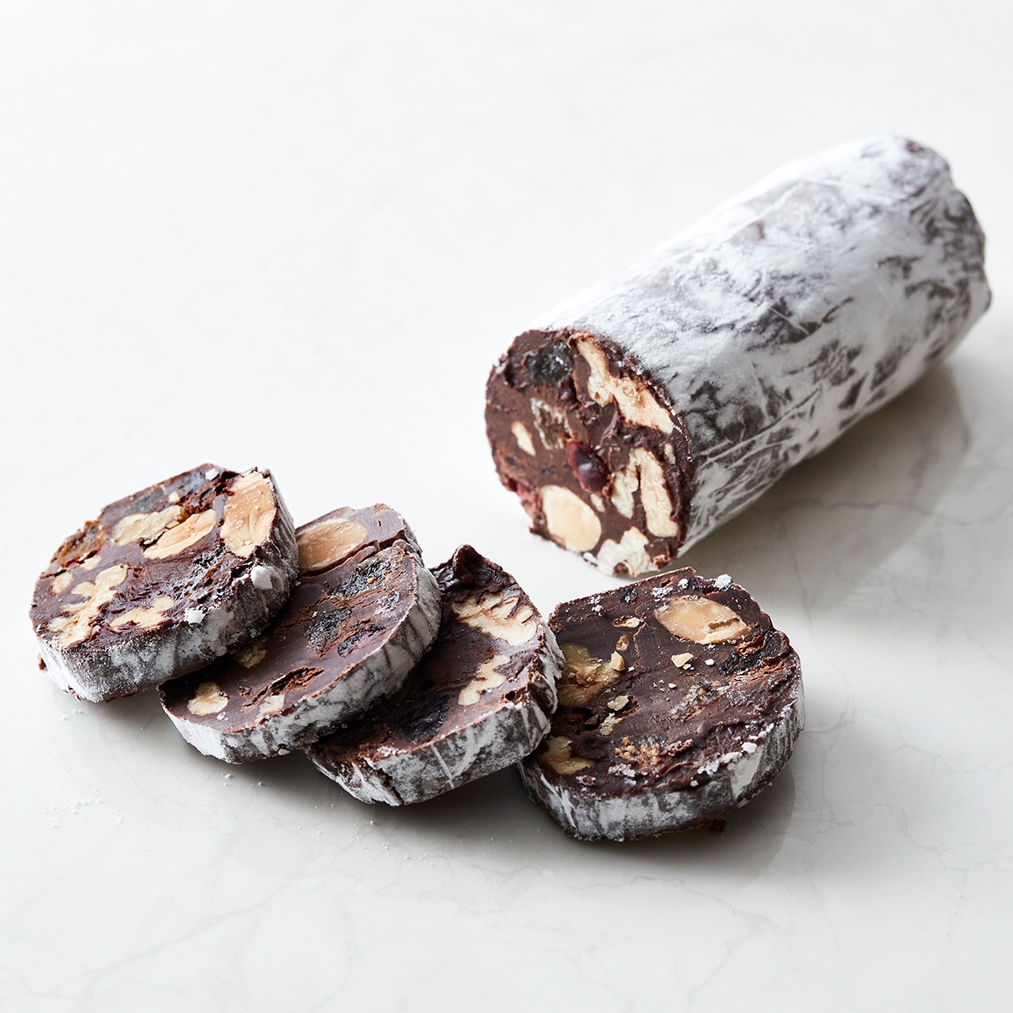 フランス語でサラミという意味のソシソン。BOUL’ANGEでは、濃厚なガナッシュに5種のドライフルーツと3種のナッツを贅沢に配合した、大人のチョコレート「ショコラ・ソシソン」を店舗限定でご用意。フルーティな味わいとチョコレートの濃厚さを存分に堪能できる逸品です。お酒とのペアリングを楽しんだり、冬のゆったりした時間にぜひご賞味ください。