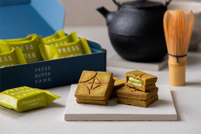 コクのあるバターとの相性を考え、すっきりとした苦味と、香りの良い宇治抹茶を使った緑鮮やかな抹茶バタークリームとバターキャラメルを挟んだバターサンド。