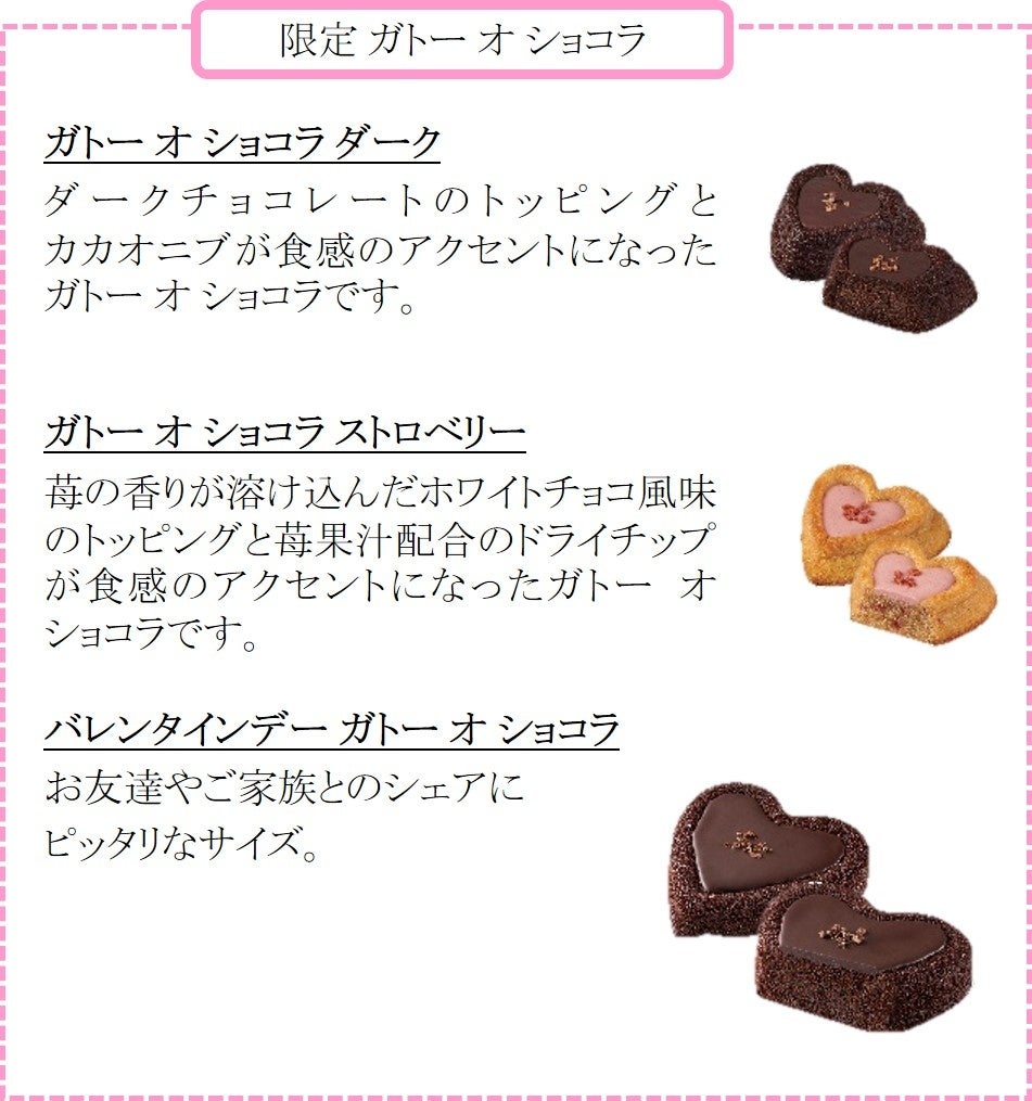 ベルギー産チョコレートなどを丁寧に練り込みじっくりと焼き上げたハート形のガトー オ ショコラです。ベルギー産チョコレートを使用した本格的な美味しさです。パッケージにも、ガトー オ ショコラをイラストで描き、バレンタインらしいデザインにしました。