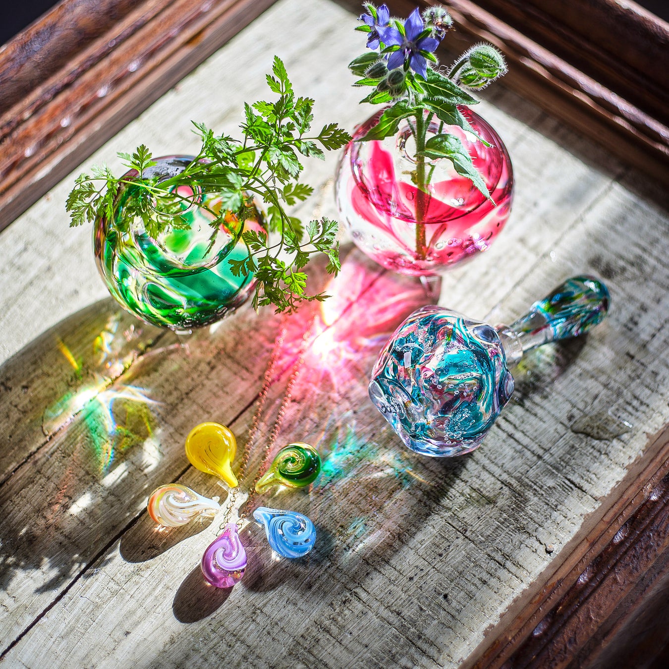 PART1<小樽市/幸愛硝子>上:ジュエルワンフラワー 各6,600円、中右:ジュエルポット 18,700円、下:ドロップペンダント各種 各6,600円