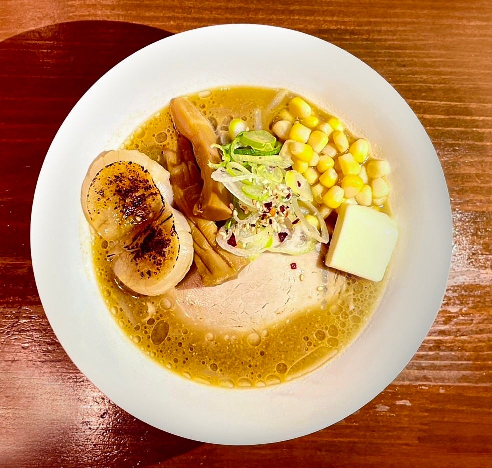 札幌ラーメンのコラボレーション。マルセイバターとコーン、ほたてなどをトッピング。にんにくとほのかに香る山椒で調和された濃厚な味噌スープに、溶けたバターと甘みのあるコーンが相まって絶妙な味わいに。