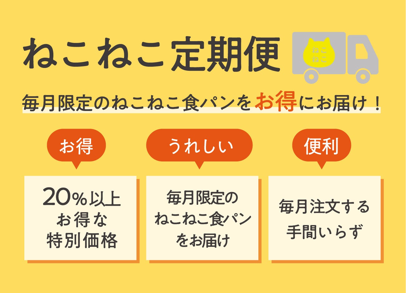 オールハーツモールでは、ねこねこ食パンが毎月ご自宅に届く「ねこねこ定期便」を販売しております。