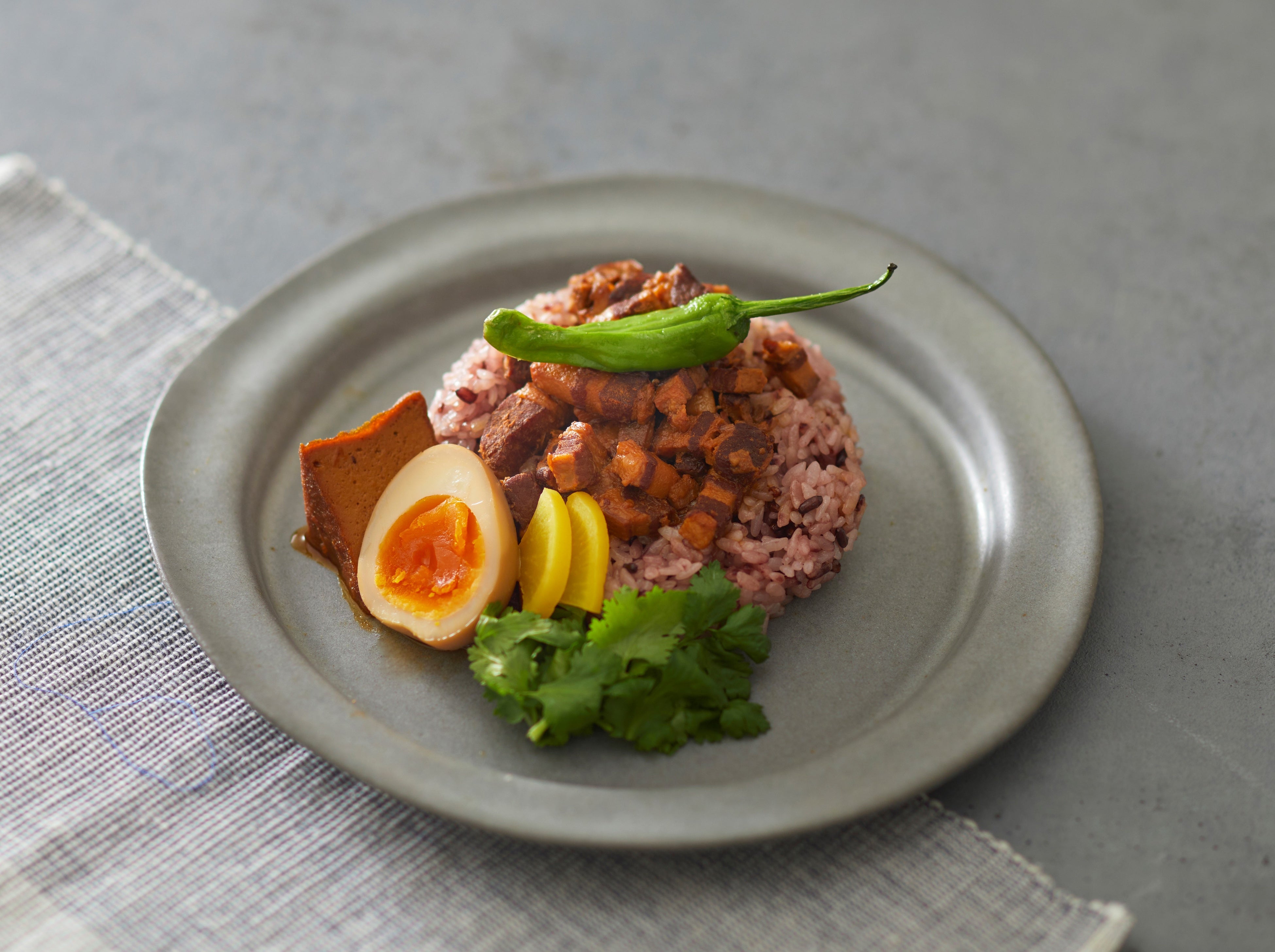 八角などのスパイスをきかせた豚バラの煮込みをジャスミライスにかけたルーロー飯。香りも味わいもエキゾチックな丼は、アジアご飯好きならきっとハマるはず。