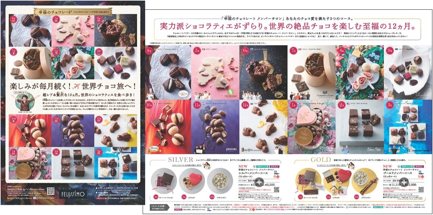 フェリシモが展開する、海外レアチョコレートの専門サイト・カタログ「幸福(しあわせ)のチョコレート®」は、2023年、毎月定額でさまざまな海外レアチョコレートが届く「幸福のチョコレートメンバーサロン」の第三期ウェブ募集を12月15日より開始しています。メンバーになると、“チョコレートバイヤーみり”による“今月のショコラティエとチョコレート”の解説が視聴できるオンラインサロンに毎月参加できます。海外チョコを輸入するバイヤーとして26年のキャリアを持つ“チョコレートバイヤーみり”が、これまで海外を旅して日本に紹介してきたチョコレートの数は約2,500種類以上。現地事情やショコラティエの思いなどを語る軽妙なチョコトークは興味深いと、専門家の間でもファンがいるほどです。コースは2つ、月額5,500円・12,000円(税・送料込み)から選べます。届くチョコレートはひと月1ブランド(1個または1セット)で、コースによって届くチョコレートのボリュームが変わります。第三期は12ヵ月で12人の世界の人気ショコラティエのチョコを味わうことができ、サロンだけのチョコ話を見ながら味わえるのがポイントです。
