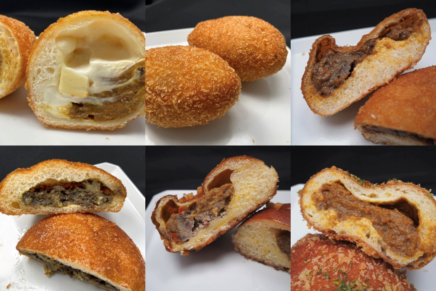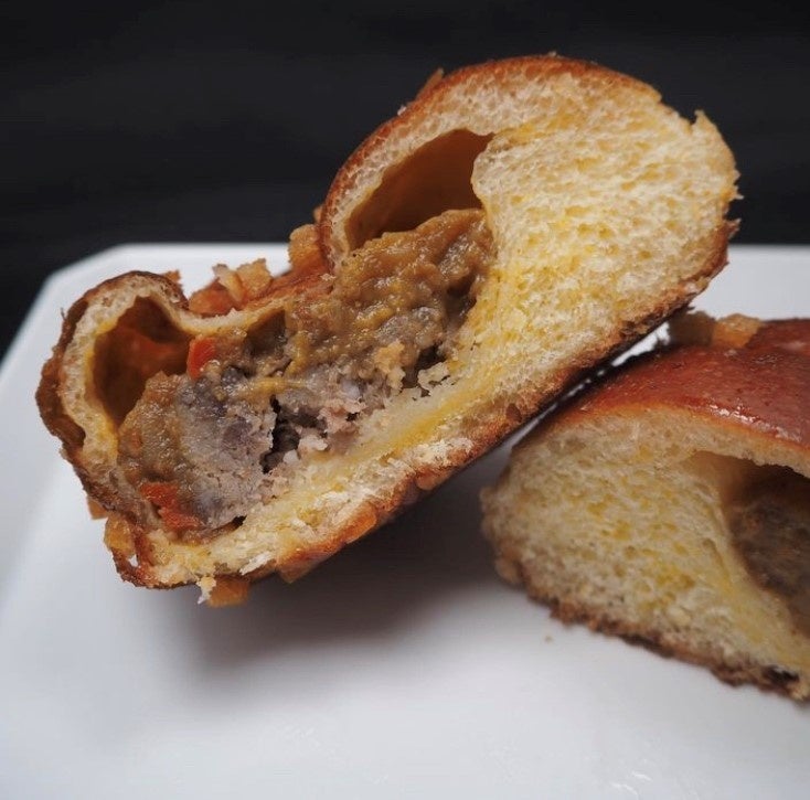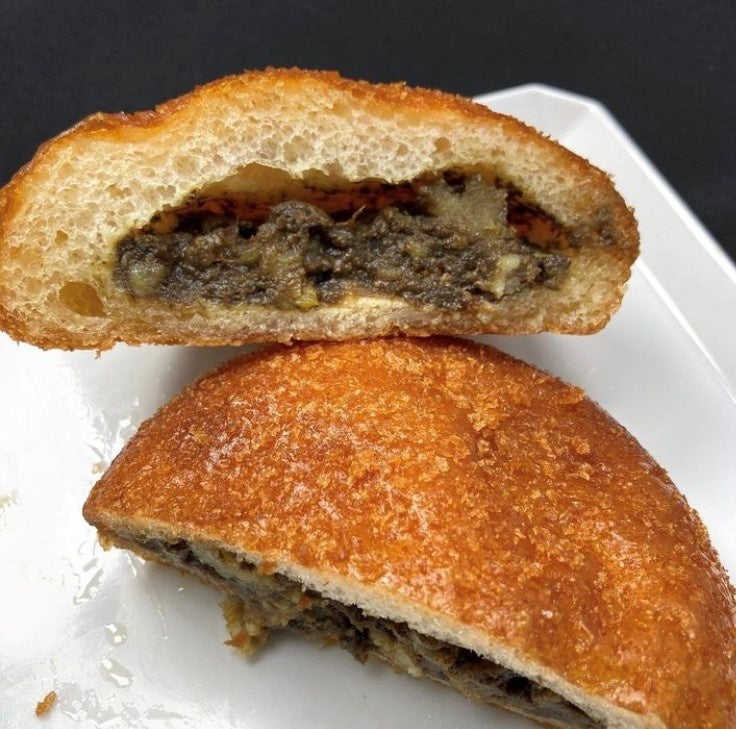 牛すじの旨味が溶け込んだ黒カレーを包み、高温で短時間さっと油にくぐらせたカレーパン。中の牛すじが柔らかく美味。