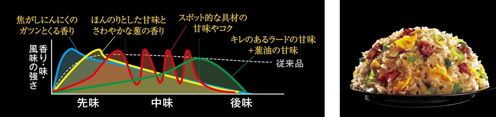 「ザ★®チャーハン」は、焦がしにんにくの香りを引き立たせ、口に入れた瞬間感じる先味のにんにくの風味を強めるとともに、焼豚の甘みやうま味をより感じられるようにすることで、具材と一緒にチャーハンを食べ進めるときの味のコントラストを強め、“無性に食べ進めたくなる味”をさらに追求しました。