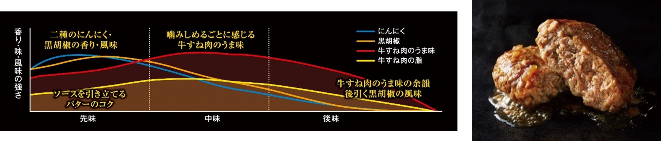 「ザ★®ハンバーグ」は、牛100%の肉のうま味や、にんにく醤油と黒胡椒、バター香るソースの味はそのままに、肉やソテーオニオンなどの配合を見直し、よりふっくらとジューシーになりました。また、電子レンジ調理の加熱ムラを解消するために、ハンバーグ自体の容量を140gから130gに変更しました。