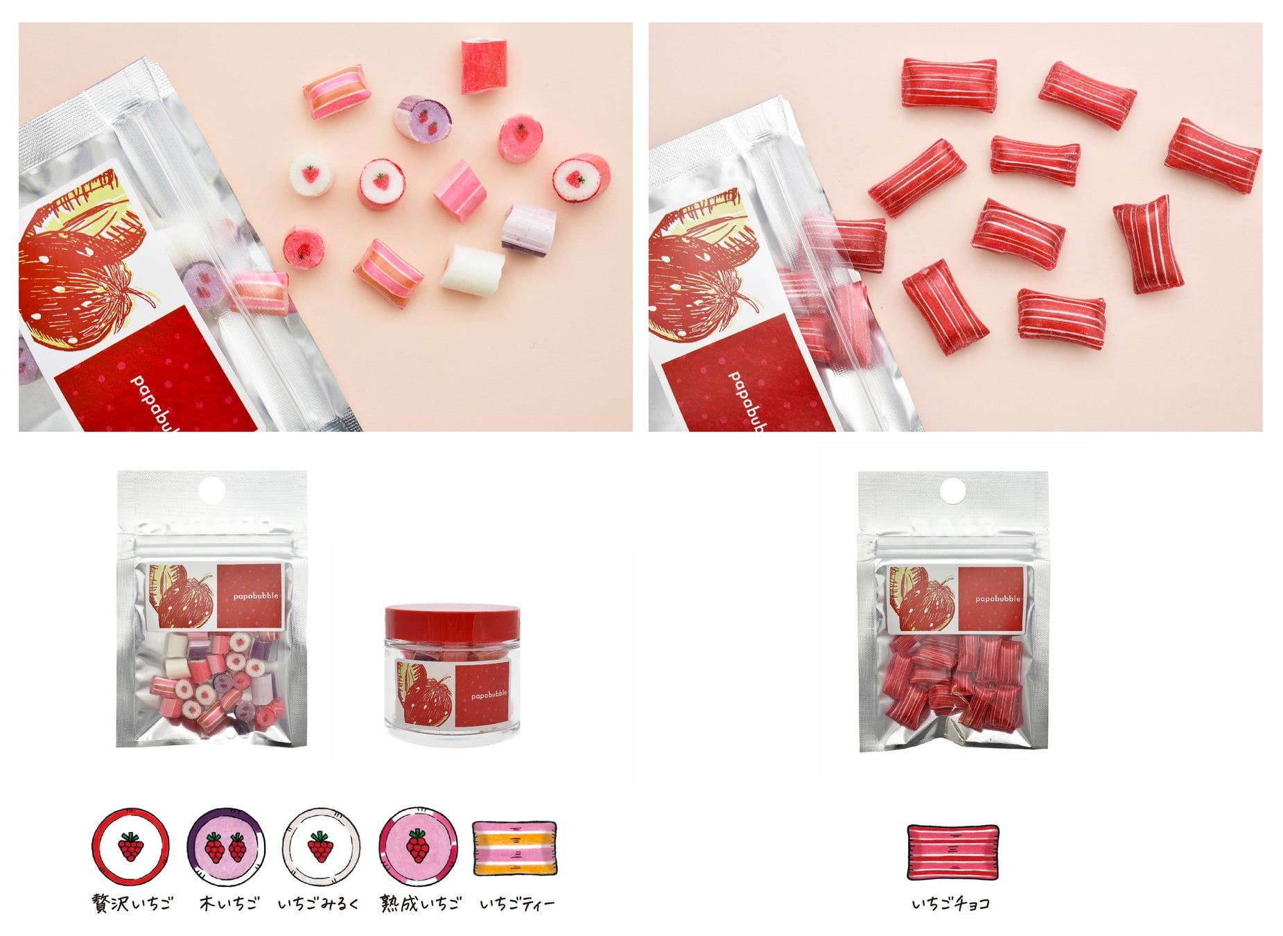 「世界一おもしろいお菓子屋さん」アート・キャンディ・ショップ「PAPABUBBLE/パパブブレ」は、いちごがもっとも美味しいといわれる1月より、様々ないちごの美味しさを満喫するキャンディ、グミ、チョコレートを発売します。