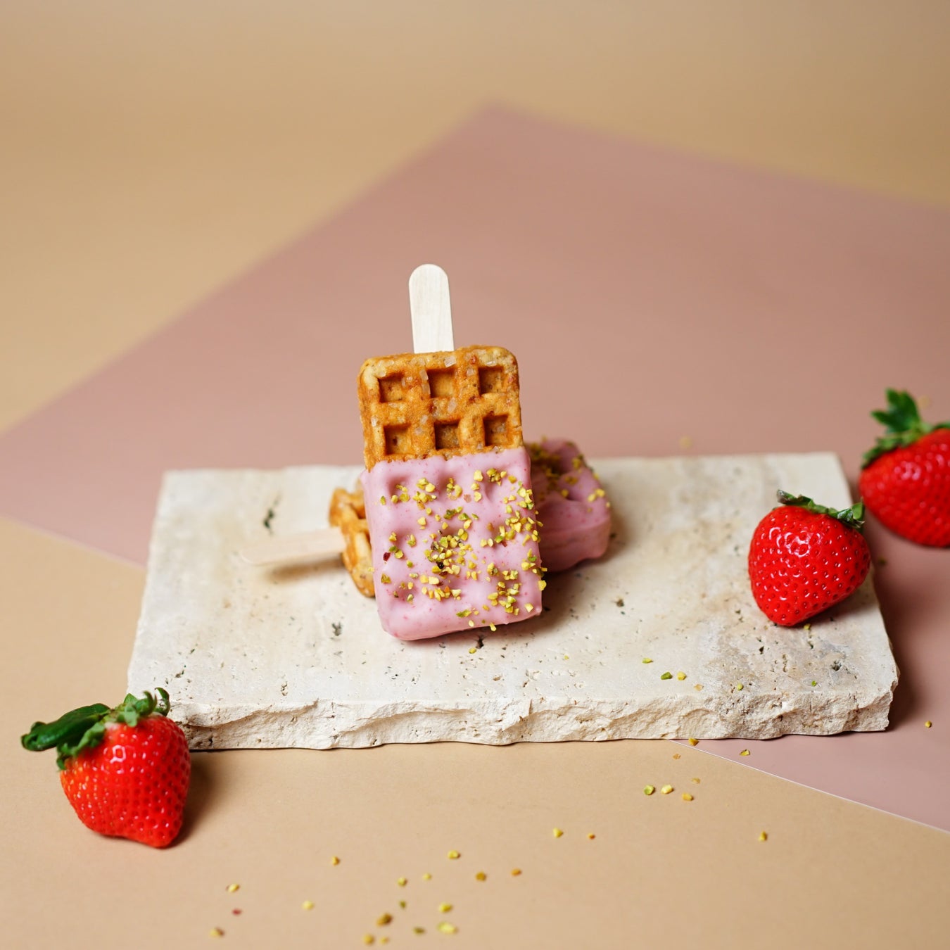 焼きあがった生地にはストロベリーチョコレートをたっぷりとディップし、ピスタチオをトッピング。