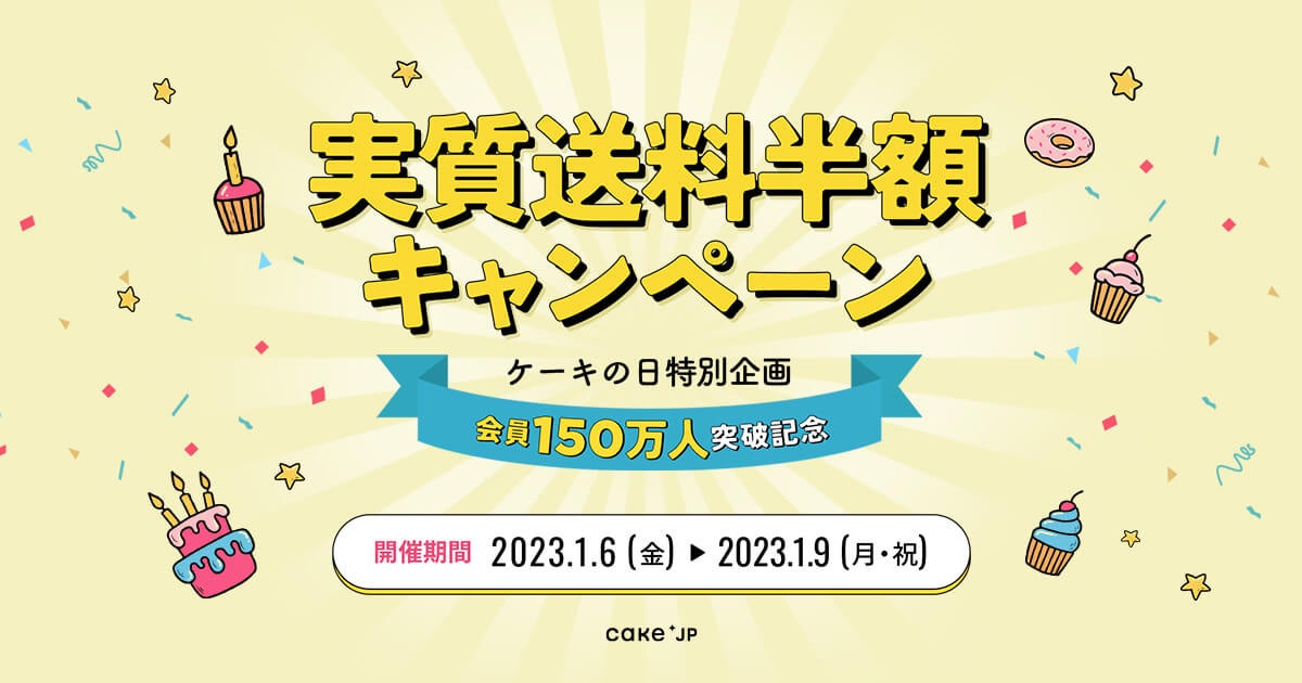 ケーキ・スイーツ専門通販サイト「Cake.jp(ケーキジェーピー)」を運営する株式会社Cake.jp(本社:東京都新宿区、代表取締役:髙橋 優貴)は、個人会員数が150万人を突破したことを記念し、1月6日(金)の『ケーキの日』にあわせて、【会員150万人突破&ケーキの日特別企画】実質送料半額キャンペーン実施いたします。