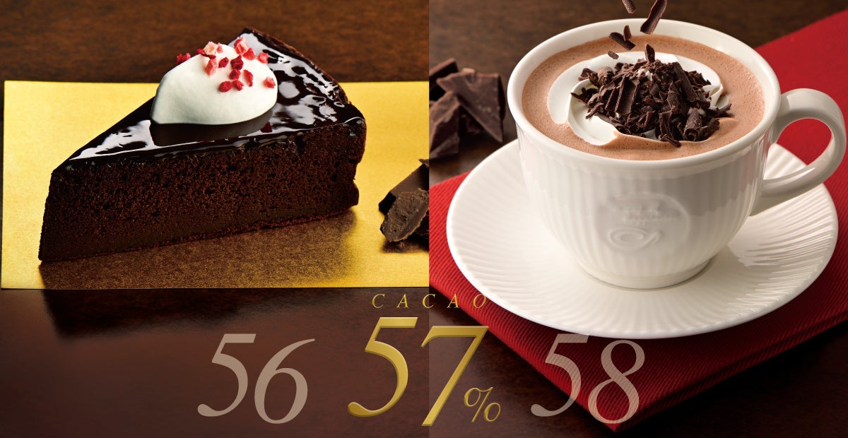 デザートメニュー「濃厚ガトーショコラ〜カカオ57%〜」は、定番の「ベルギー産チョコレートケーキ」の3倍のチョコレートを配合した、濃厚なガトーショコラです。カカオ分57%のチョコレートを使用しており、チョコレートのコクとしっかりとしたカカオの風味をお楽しみいただけます。天面はチョコレートでグラサージュ(※つや出し)しており、ホイップとフリーズドライストロベリーをトッピングしました。濃厚な味わいのガトーショコラには、深みのあるコクを持つブレンドコーヒーとのペアリングがおすすめです。