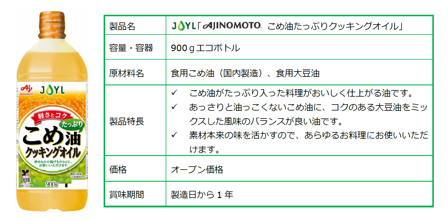 今回新たに発売するJOYL「AJINOMOTO こめ油たっぷりクッキングオイル」は、こめ油がたっぷり入った、料理がおいしく仕上がるクッキングオイルです。あっさりと油っこくないこめ油に、コクのある大豆油をミックスしており、風味のバランスが良く、素材本来の味を活かすので、あらゆる料理にお使いいただけます。