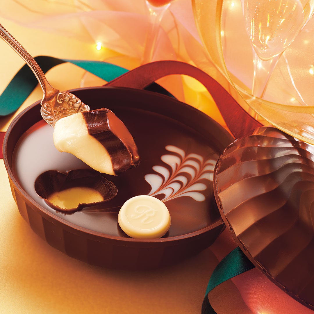 イタリア・ウンブリア州の赤ワインをカカオの風味豊かなチョコレートと合わせたガナッシュと、「恋人達のキュヴェ※」という名を持つシャンパンにブランデーを少し加えて、ホワイトチョコレートと合わせたガナッシュを2層に重ね、チョコレートの器に入れました。